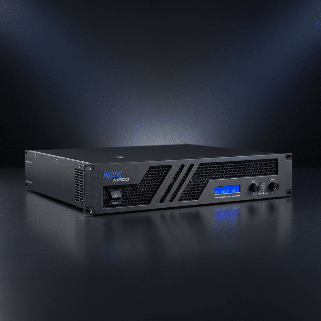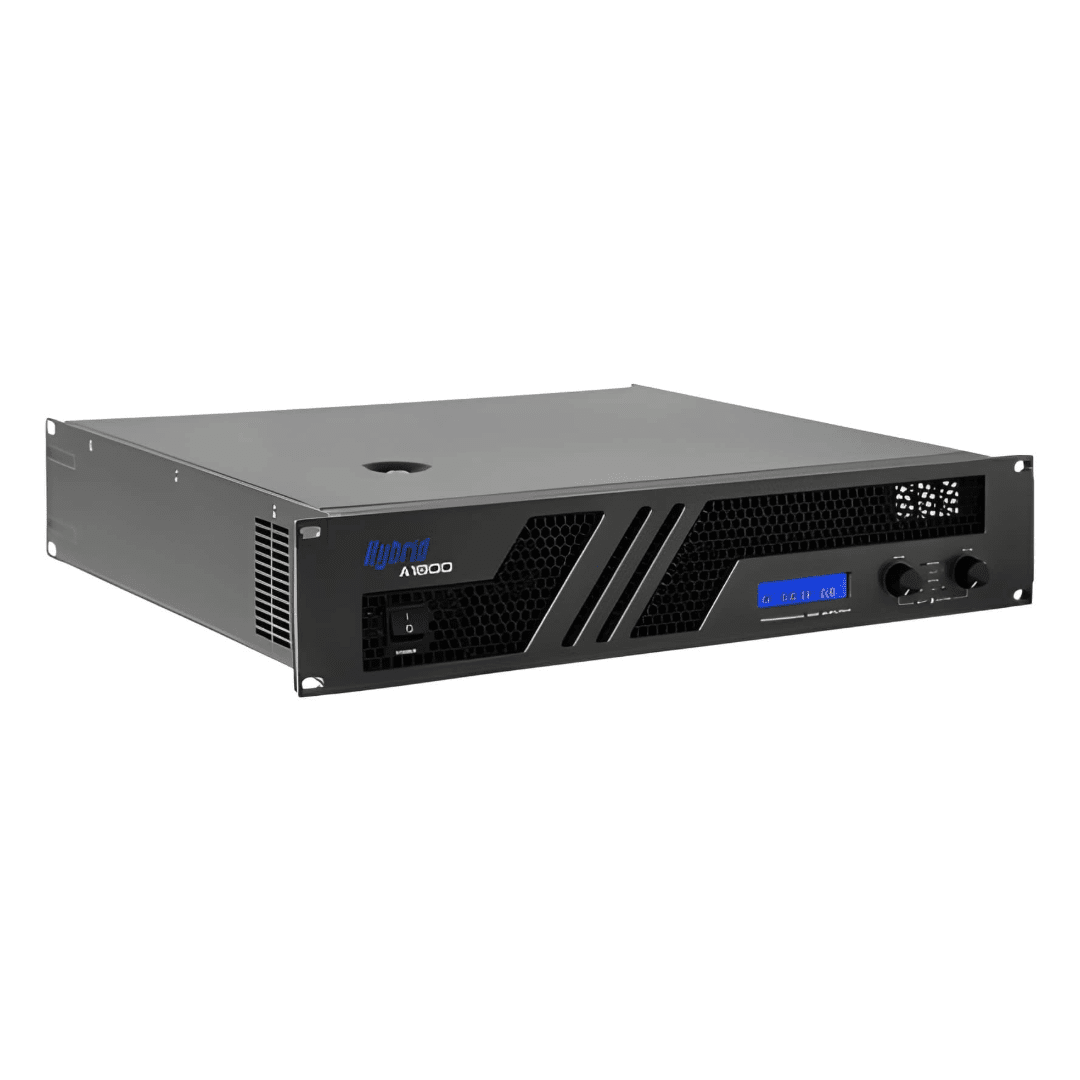 The Hybrid B1800 MK6 is a robust, 19″, 2U rack-space, 2 channel power amplifier with an onboard front panel LCD screen indicating channel gain, channel temperature and mains voltage, as well as front panel LED indication for signal, limit and protection.