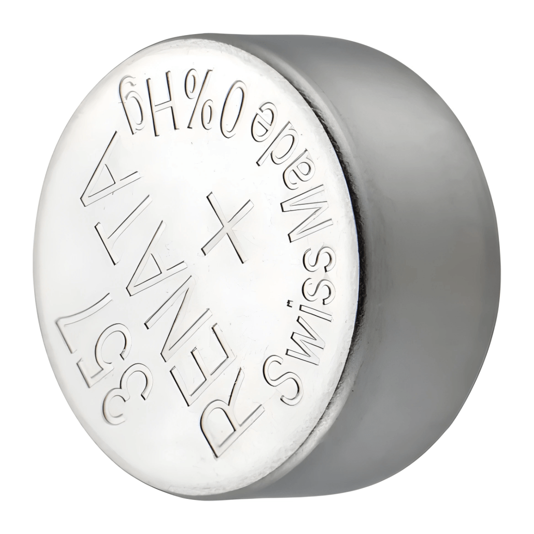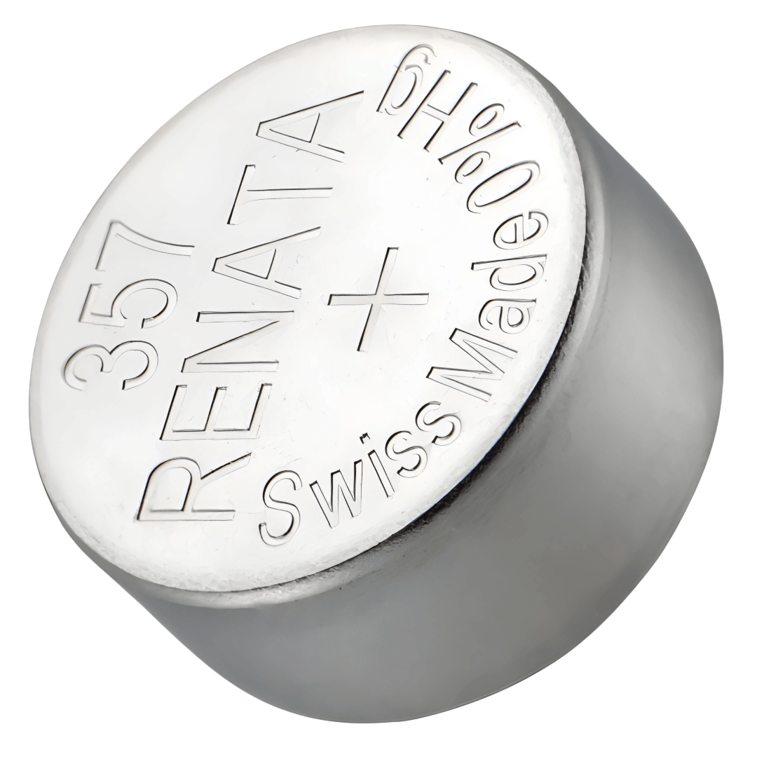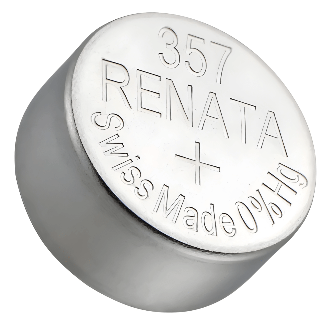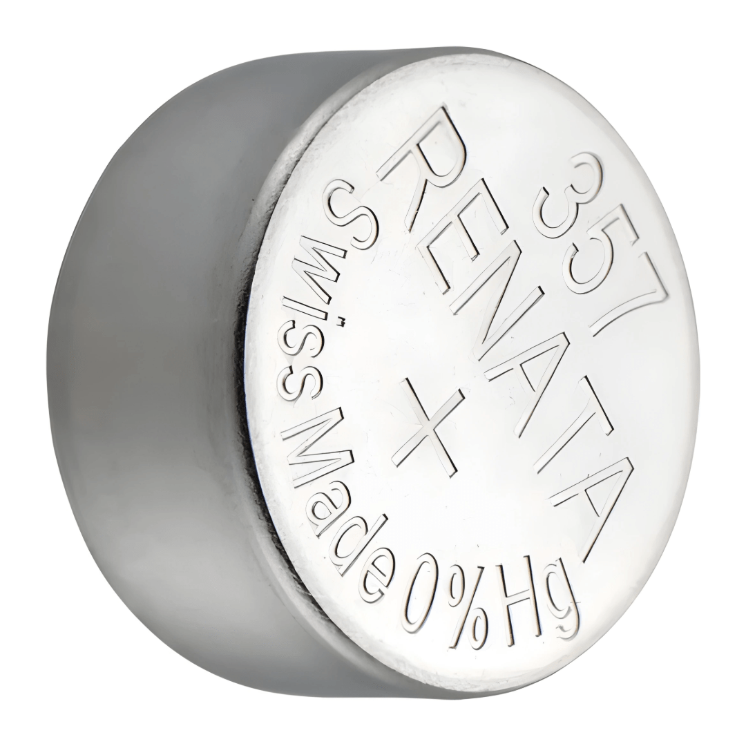 The Renata 357 is a silver‑oxide coin cell (also known as GP357, SR44W), delivering 1.55 V with about 160 mAh capacity, measuring 11.6 × 5.4 mm — ideal for watches, calculators, keyless remotes, and other compact electronic devices