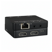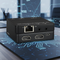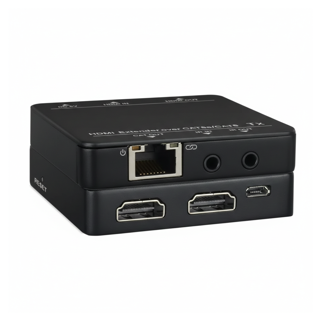 The 001-HDM-TX/RX-2 HDMI Extender is a high-performance solution designed to transmit high-definition video and audio over long distances using a single CAT5e or CAT6 network cable.