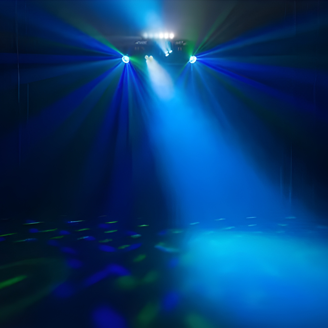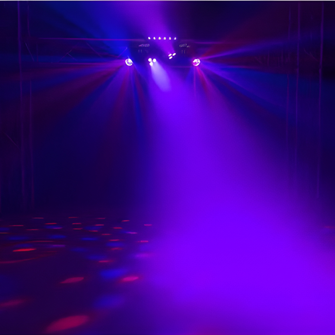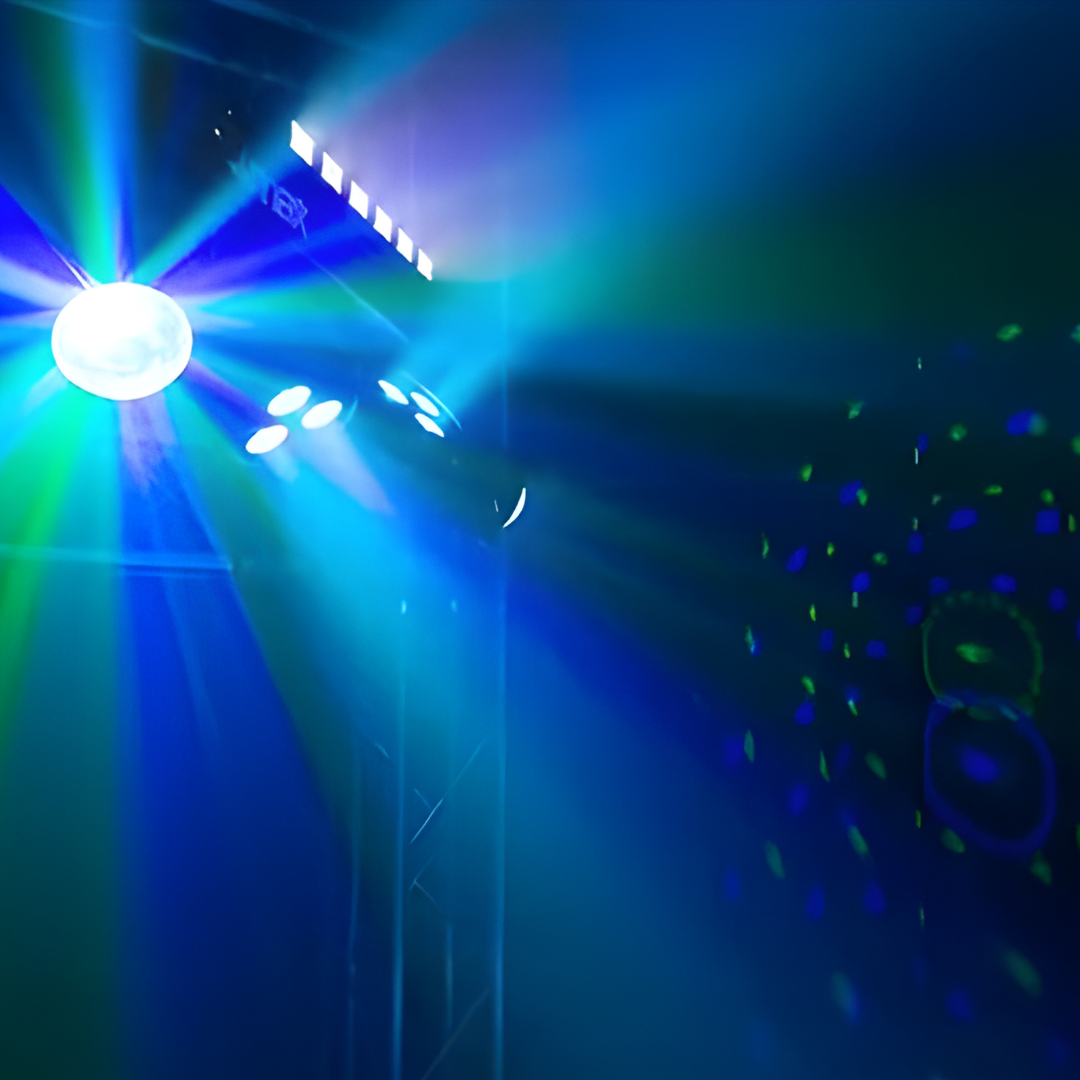 Complete party lighting kit with 2 PAR, 2 Jelly Moon, and 1 UV/Strobe unit