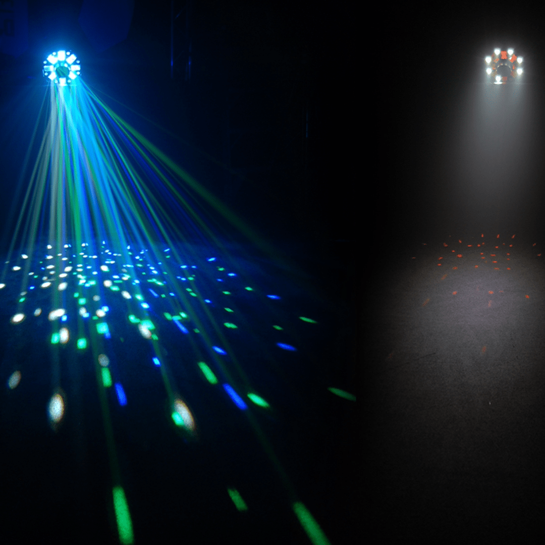 3-in-1 Lighting Effect: Combines an LED Derby, a Red/Green Laser, and a Strobe Ring for a comprehensive light show from a single unit.