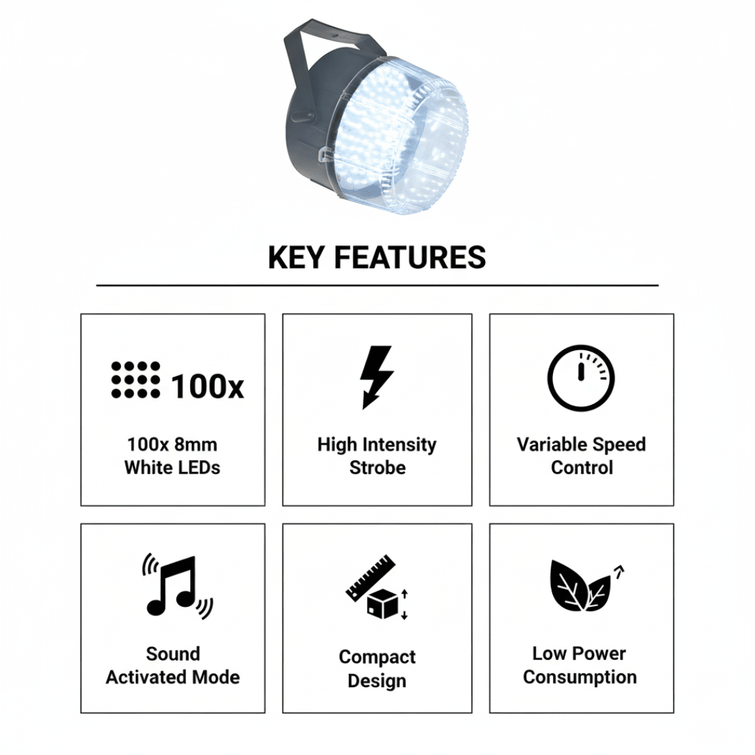 100 High-Output 8mm LEDs: Engineered for maximum brightness and a wide coverage area, ensuring the strobe effect fills the entire room.