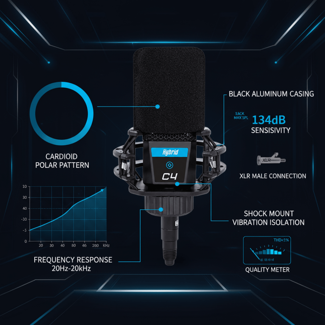 • The Hybrid C4 is a cardioid, condenser, microphone suitable for vocals in broadcasting, live streaming and studio recording.