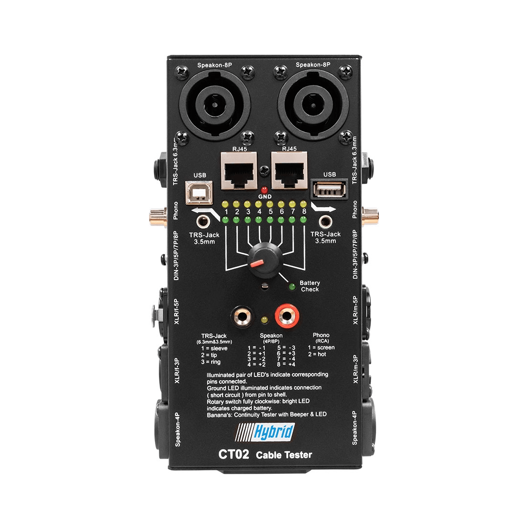 The Hybrid CT02 is a valuable tool for all applications where cables are being used for the first time, be it a permanent or temporary installation. Most system failures occur due to faulty cables so it is good practice to test all cables before using them. Hybrid offers 3 cable testing units with different testing ports to suit your needs.