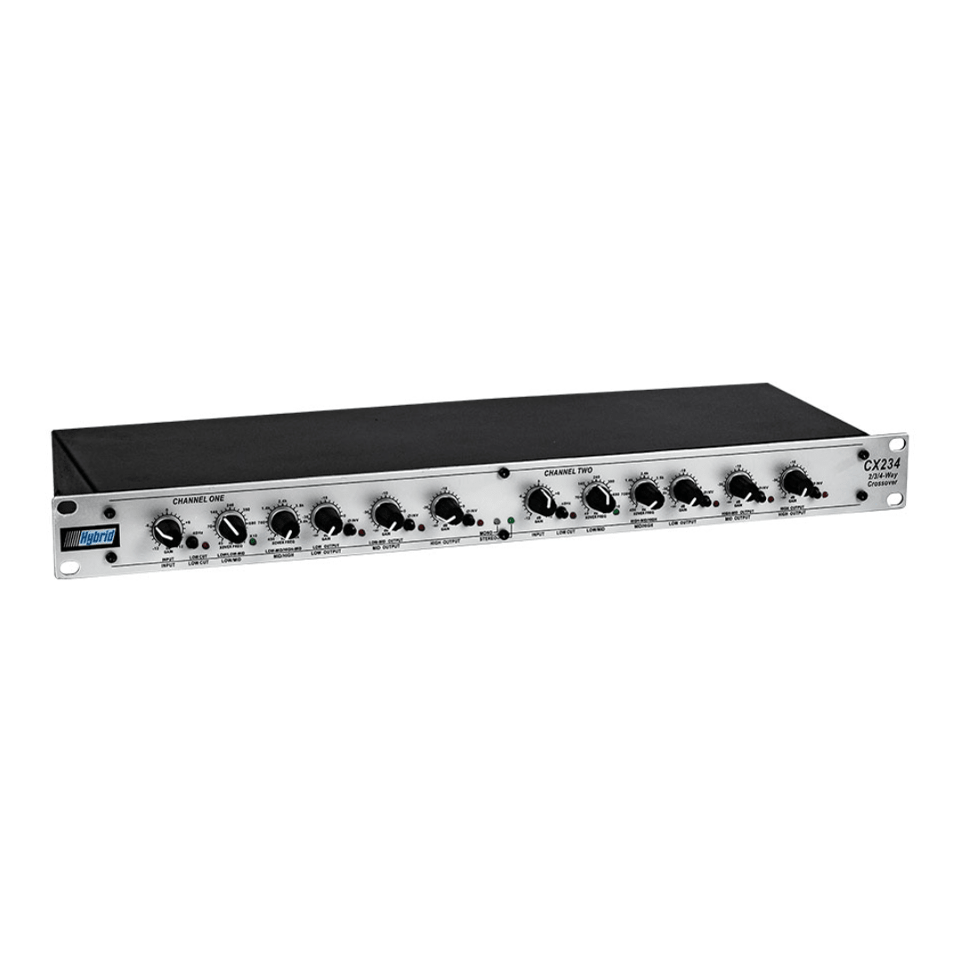 The Hybrid CX234 is a 3-way stereo/4-way mono active crossover that is suitable for any 3-way stereo active system with separate sub-bass, mids and top cabinets.