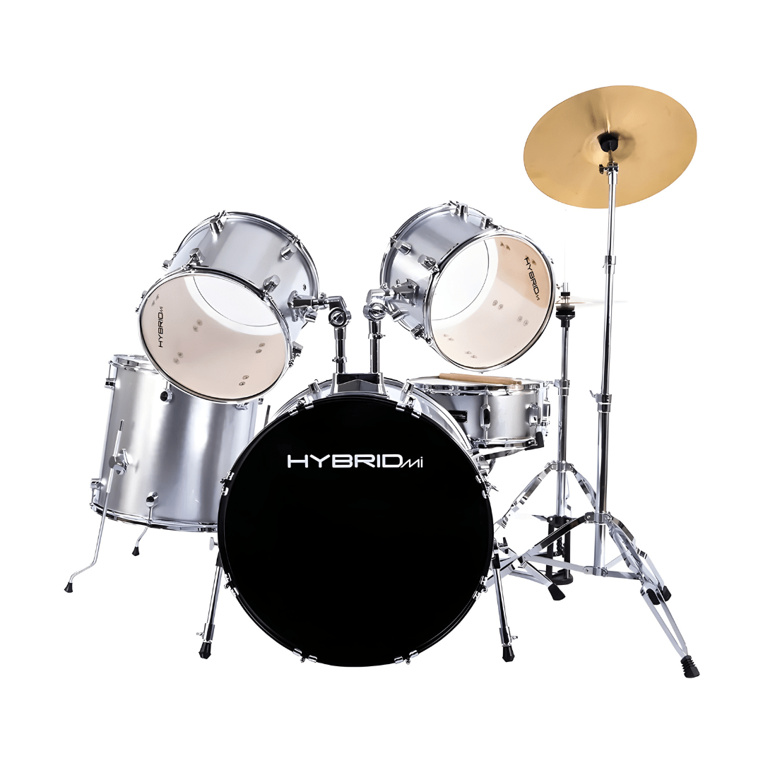 Hybrid MI introduces it’s intermediate drum package for centre stage. The standard configuration 9-ply Oak shells are equipped with 2-ply oil batter drumheads, heavy duty double-braced hardware, die-cast pedals and Paiste 101 special cymbal set and Remo drum heads.