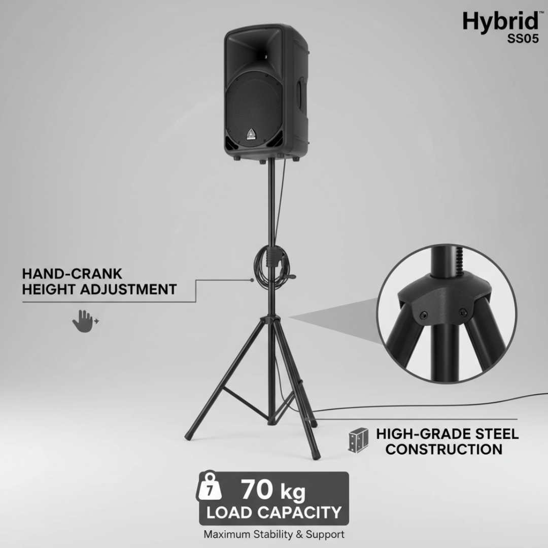 The Hybrid SS05 is a professional, full sized speaker tripod stand with an adjustable height of 1.2m to 2m. It is suitable for any speaker with a 35mm pole mount option that does not exceed 70Kg.