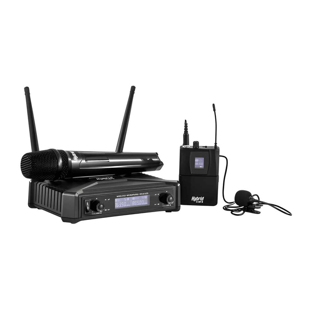 This system includes one handheld microphone, one bodypack transmitter, and a lapel mic, offering flexible options for different speaking scenarios.
