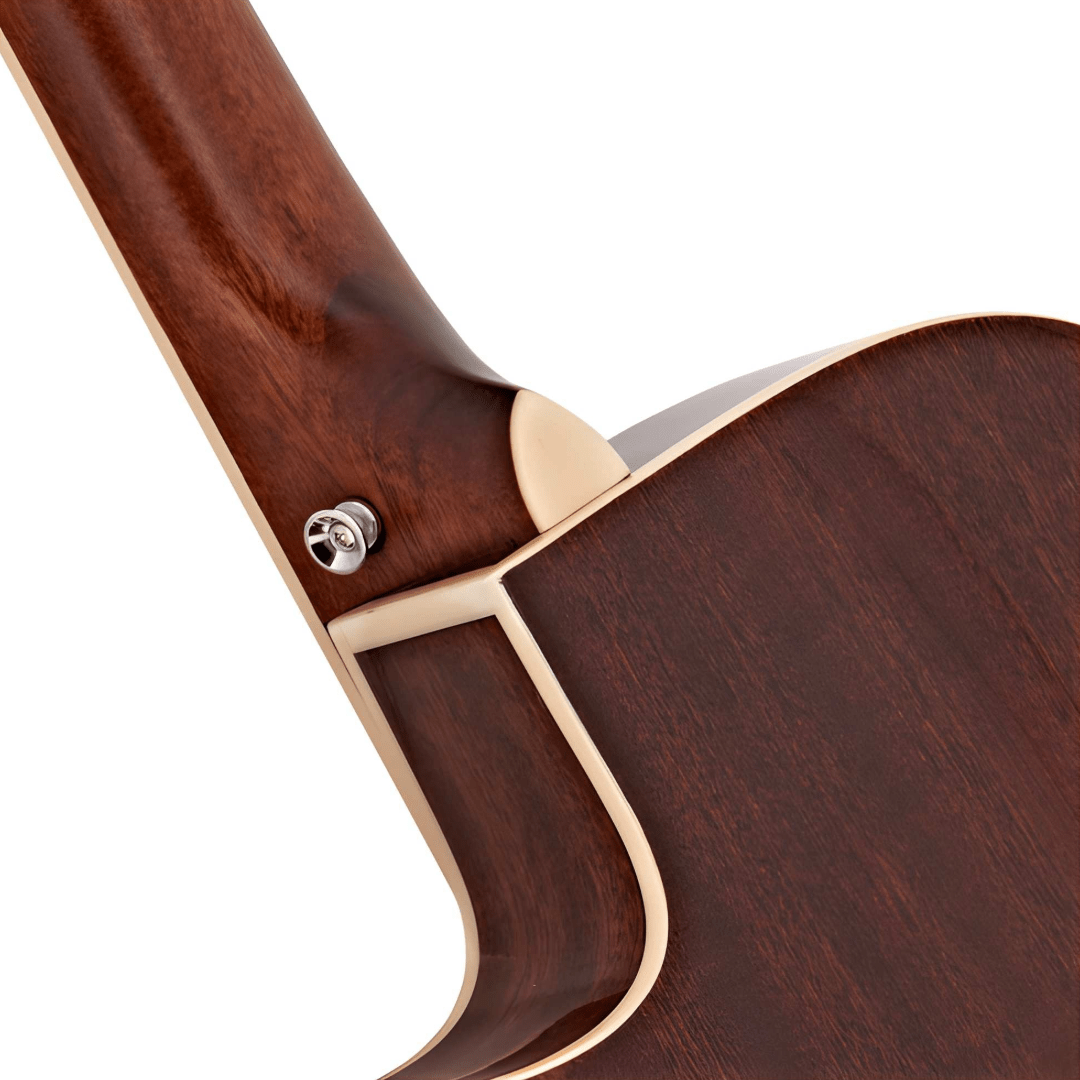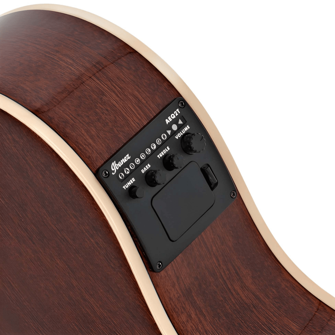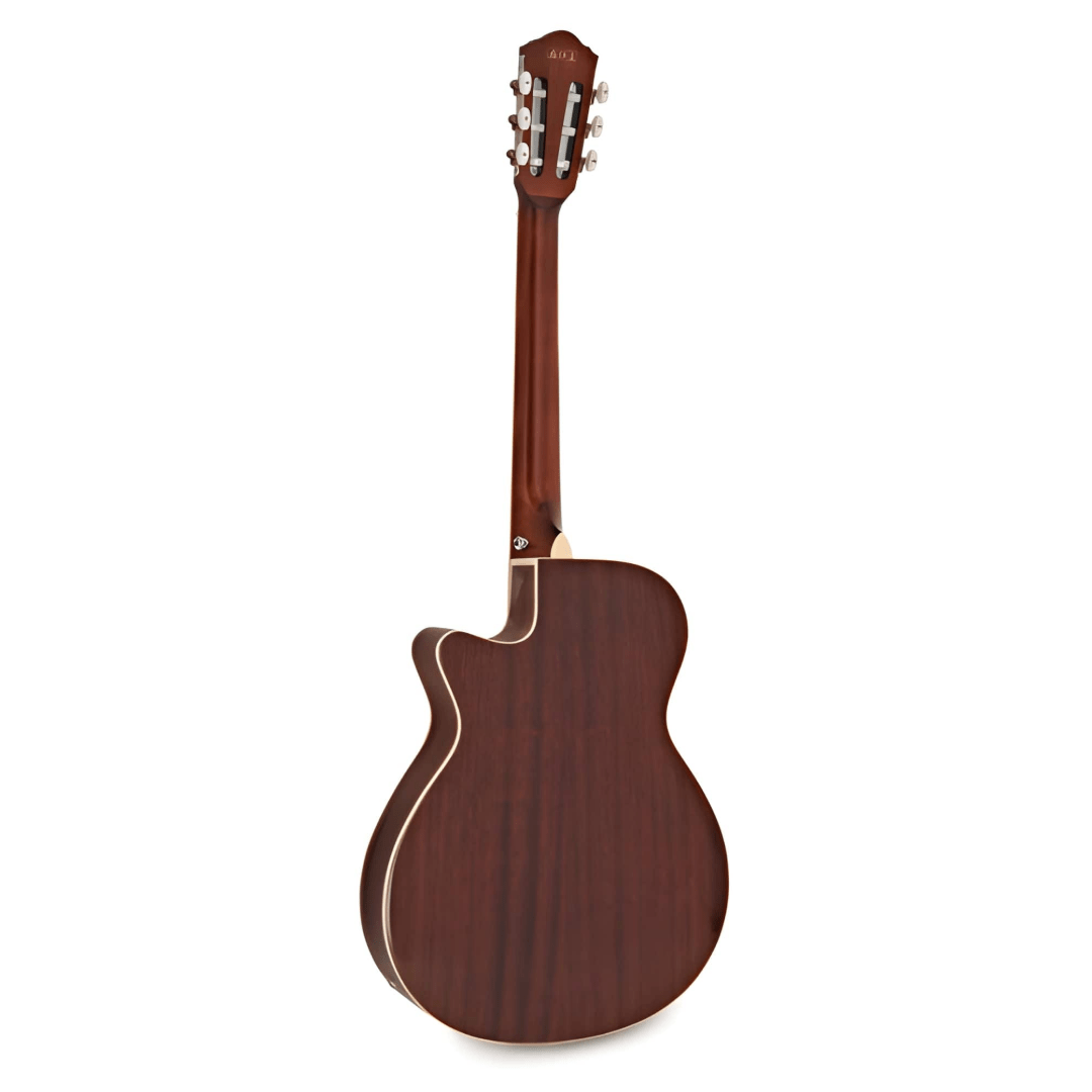 The AEG7TN features a thinner grand concert shaped body with a soft Venetian cutaway. The top is laminated spruce with binding on sapele back and sides with an open pore finish. The round soundhole has a black & white acrylic rosette. It has an okoume neck with a 25″ scale, 20-fret purpleheart fingerboard with small white dot position markers. Components include a plastic saddle in a purpleheart bridge, Ibanez Advantage bridge pins, a plastic nut, and chrome Ibanez classical tuning machines. Electronics consist of an Ibanez undersaddle pickup connected to an Ibanez AEQ-2T preamp with onboard tuner powered by a 9V battery and ¼” stereo output.