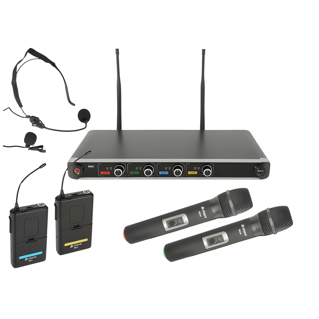 • Available in sets with 4 handheld or 4 beltpack transmitters (with a choice of neckband or lavalier microphone for each beltpack) or a combo set with 2 of each.