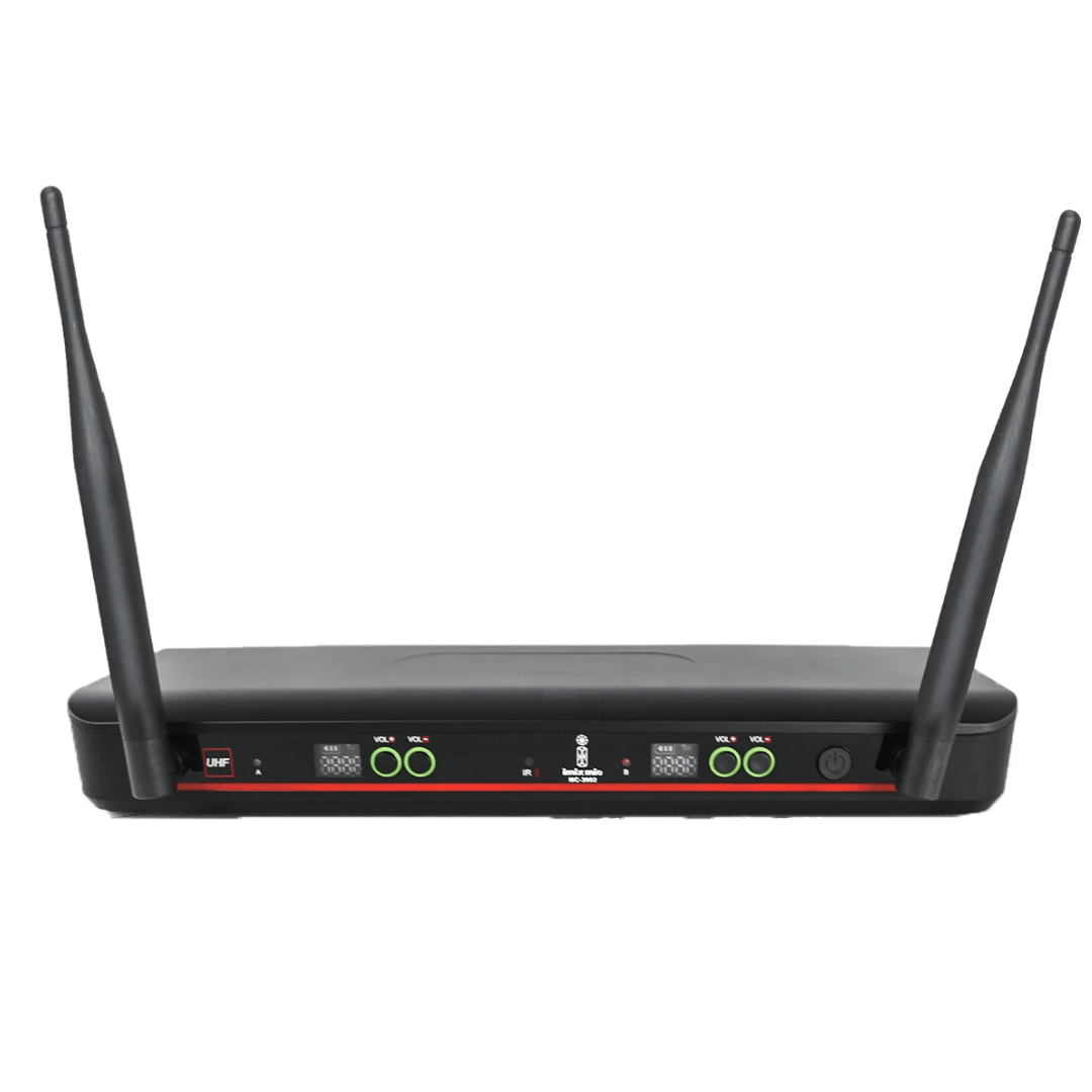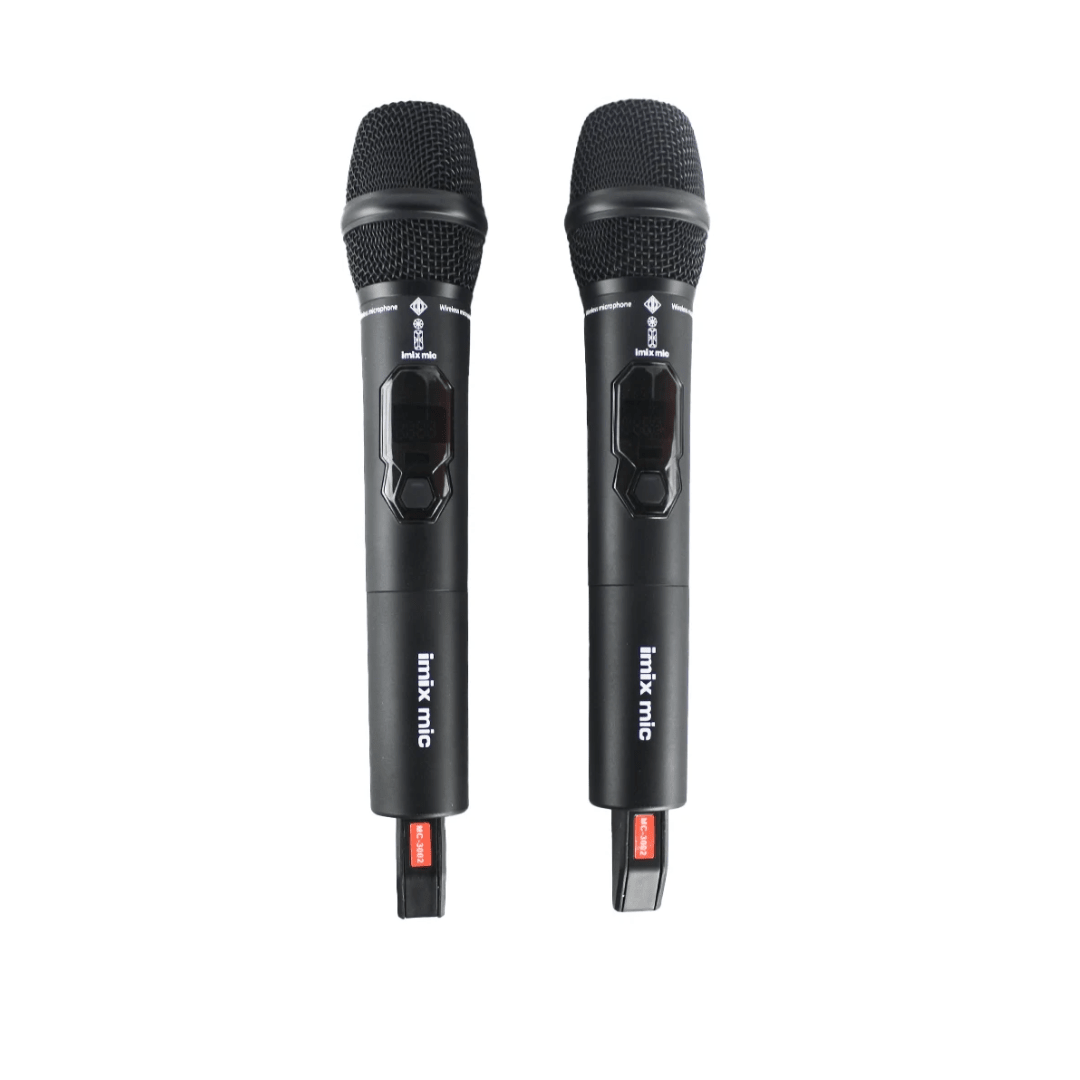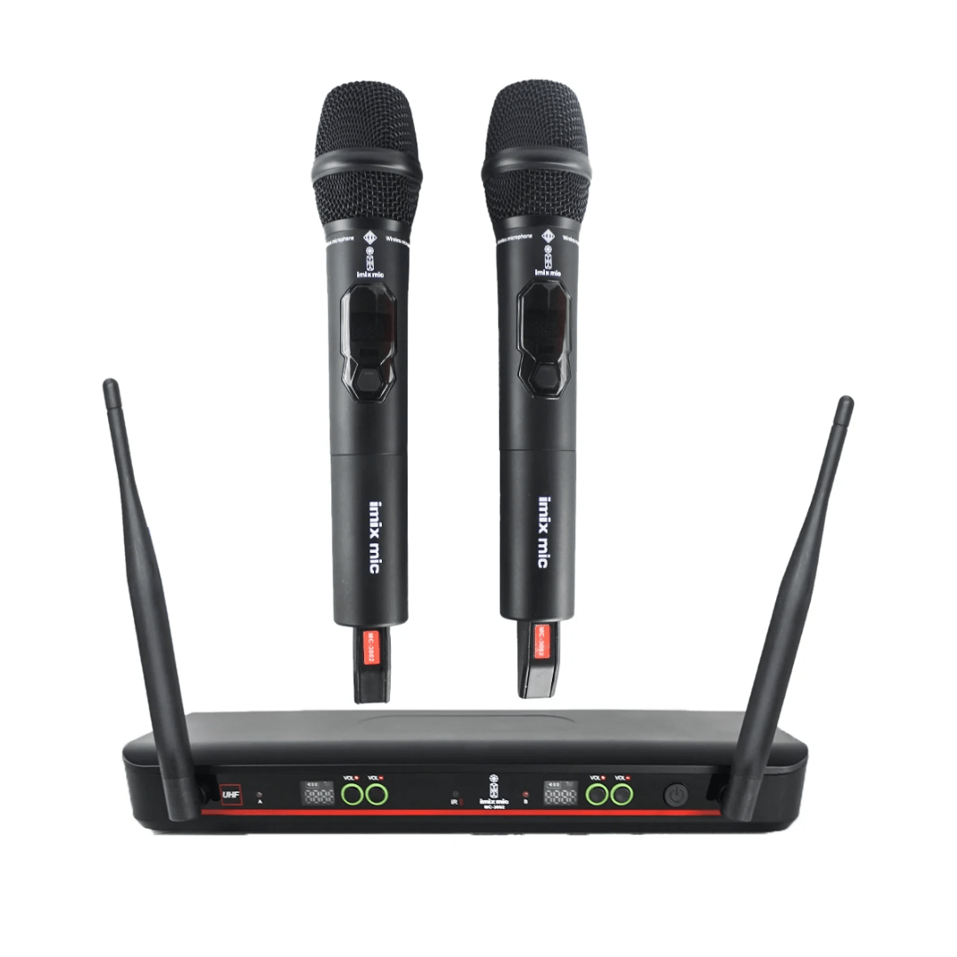 The Imix IMC3002 is a professional-grade wireless microphone system featuring a pair of UHF handheld microphones designed for clear, reliable audio transmission.