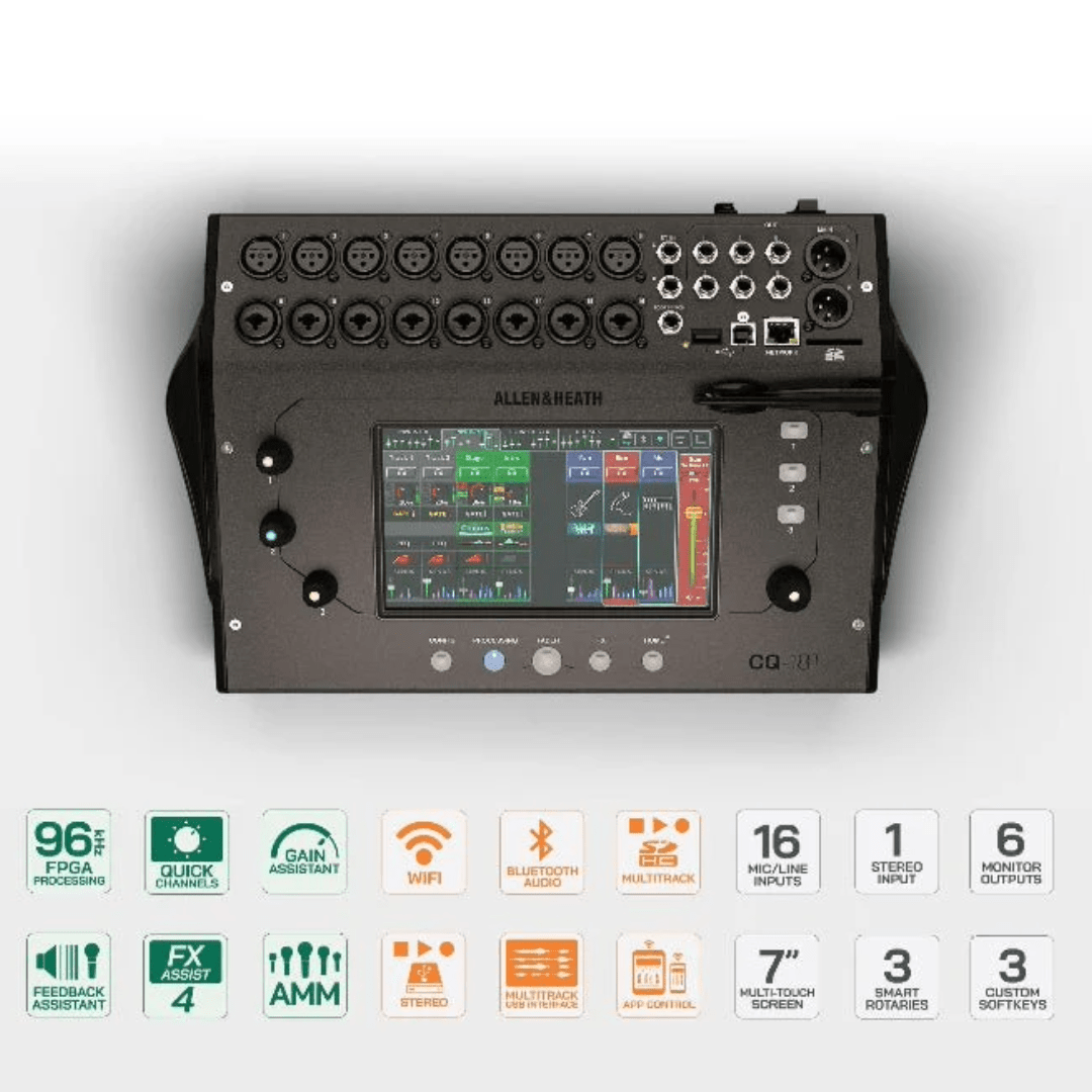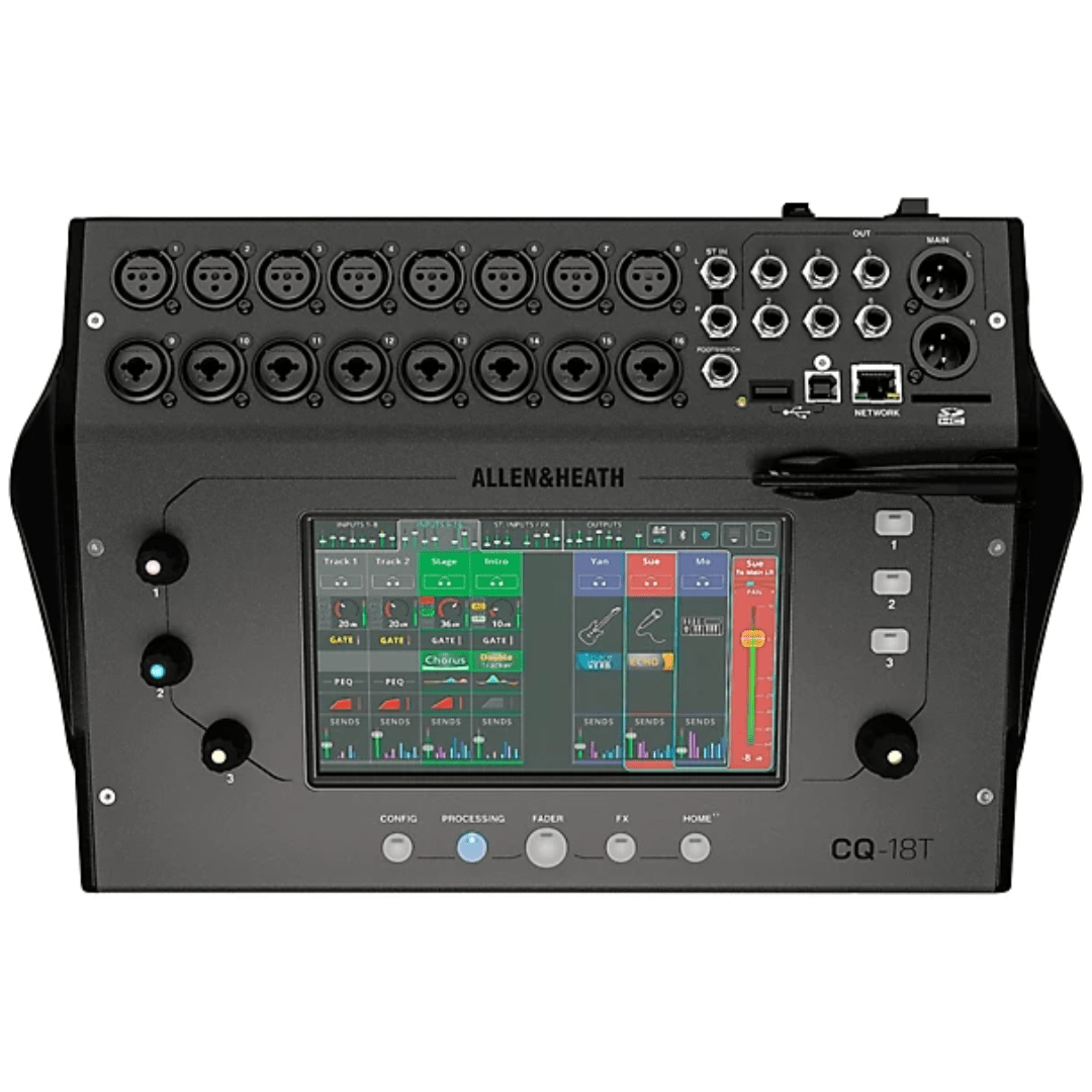 The Allen & Heath CQ-18T is a compact 18-channel digital mixer designed for live sound, streaming, installations, and portable productions. It combines Allen & Heath’s renowned processing quality with a modern, intuitive interface.