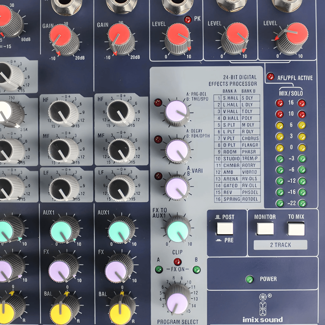 • The Imix  i-EFX 20 Channel Analogue Mixer is a compact yet powerful audio mixing console designed for small to medium-scale live sound and recording applications.