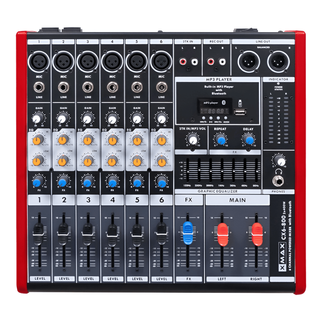The XMAX CX6-800 is a compact, powered audio mixer designed for small to medium-sized live performances, events, and recording setups. It integrates key features like Bluetooth connectivity and a built-in amp to provide an all-in-one solution without requiring external amplification.