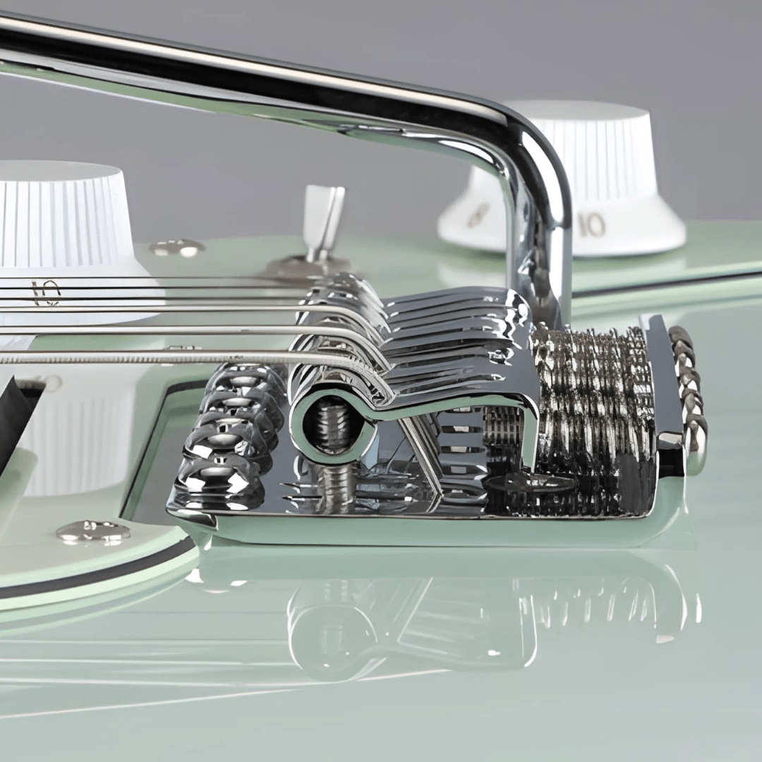 T106 tremolo w/ Comfort round Steel saddles This T106 bridge is equipped with newly developed comfort round Steel saddles. Its construction provides wider range of height adjustment and ease of setting up. Additionally, the screws are less likely to stick out, leading to less stress on your strumming hand and better playing comfort.