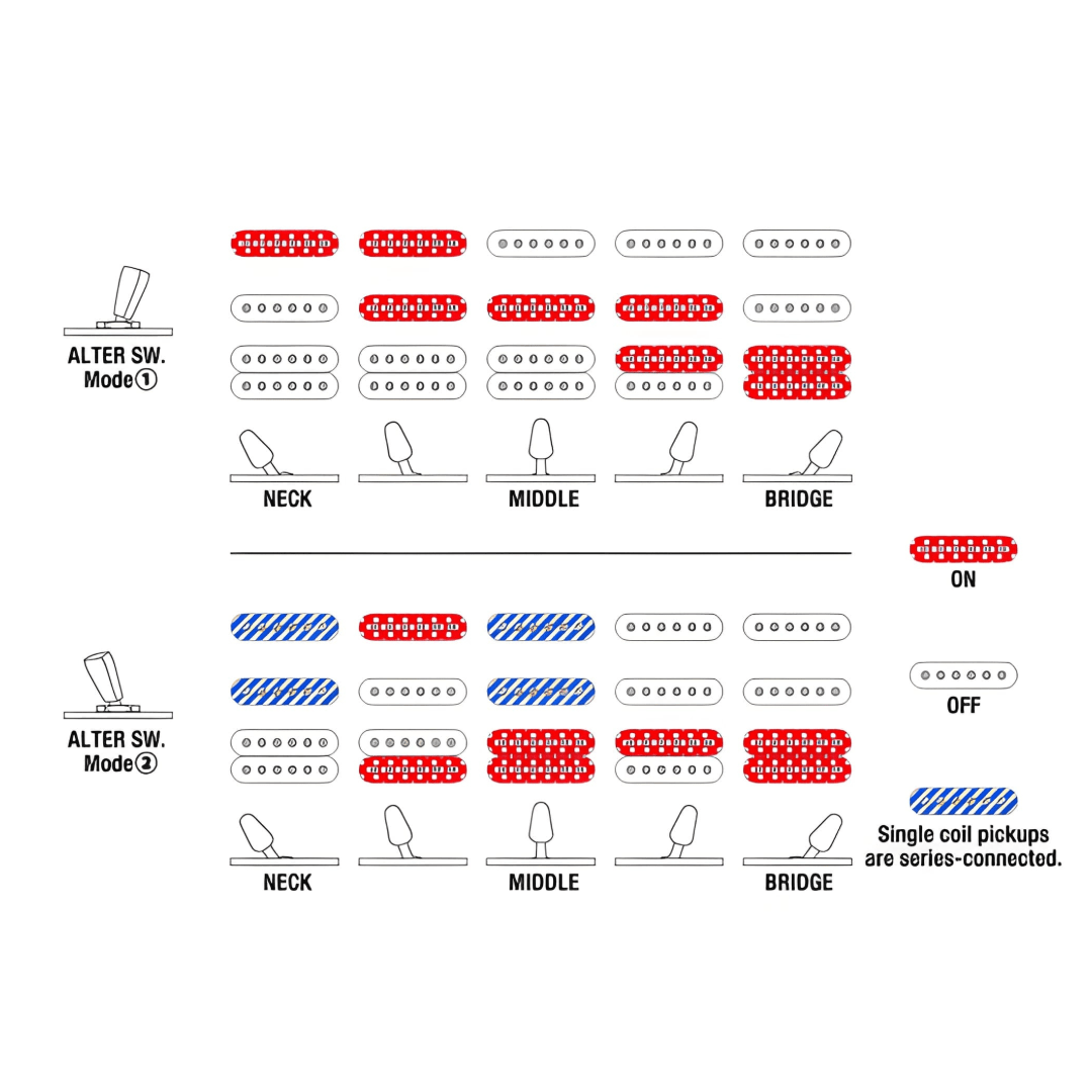 dyna-MIX9 switching system with Alter Switch The dyna-MIX 9 offers nine sound variations and can switch between humbucker and single coil modes with just a flick of the mini switch. One mode even simulates a humbucking sound from the combination of two single coil pickups
