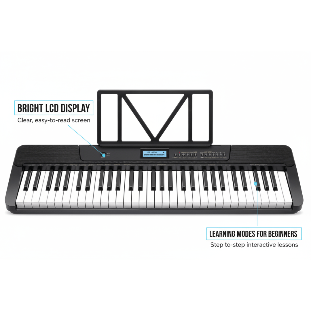 • Includes demo songs, learning modes, and an LCD screen for easy navigation.
