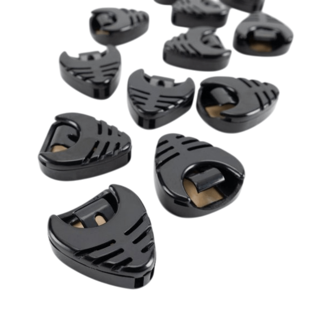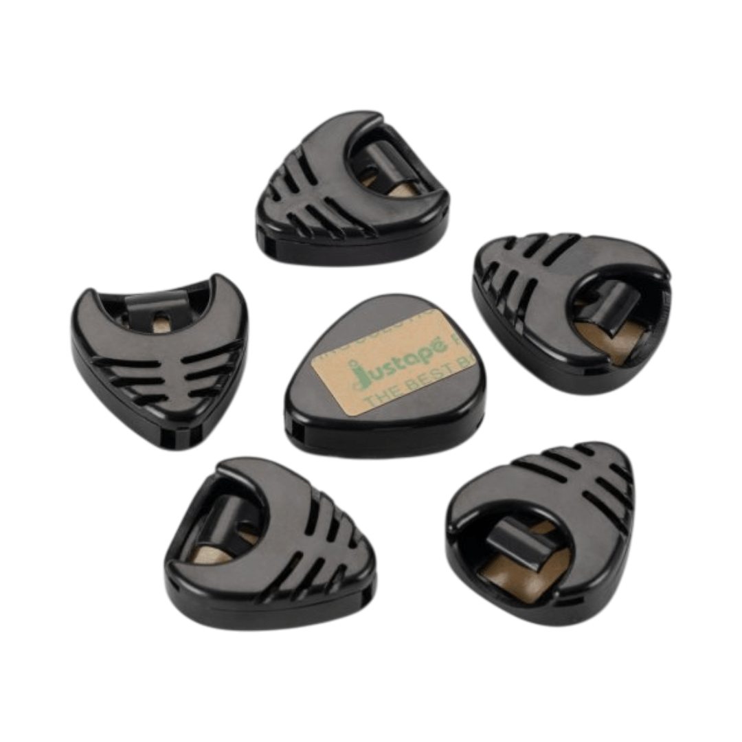 Each pick holder stores up to five medium-gauge picks or a comparable stack of light- or heavy-gauge picks. The spring-loaded chamber adjusts to firmly grasp the number of picks inside. Included peel-and-stick adhesive backing mounts the holder to guitars, amps, mic stands, or any smooth surface to keep picks within easy reach.