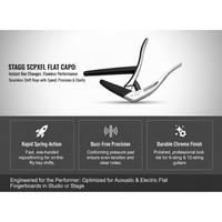 Designed to accelerate performance workflows and deliver consistent tonal integrity, the Stagg SCPX-FL Flat Capo empowers guitarists with a frictionless, rapid-response experience.