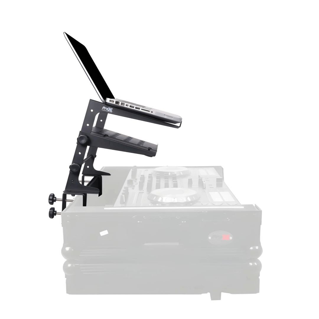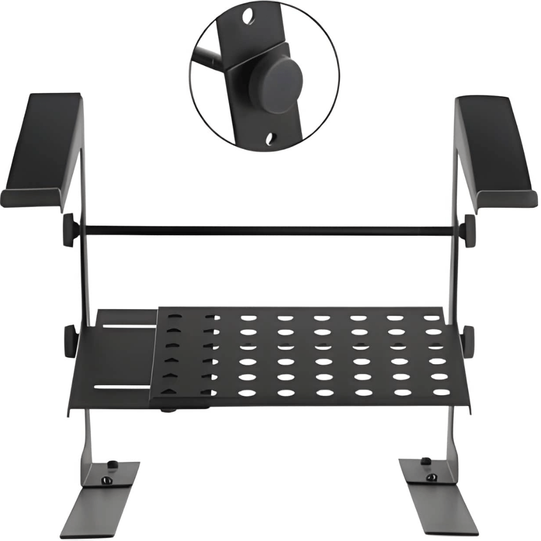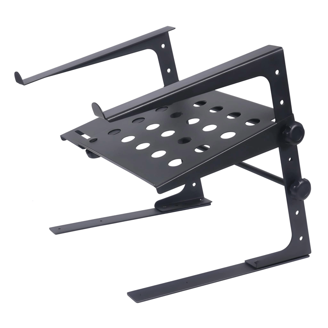 Multi-purpose stand for laptops, small mixers, CD players or DJ equipment 4 possible height settings and 2 pre-set widths Includes desk clamp adaptors for additional stability.