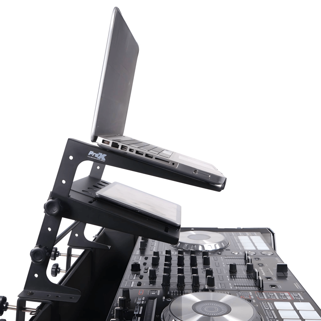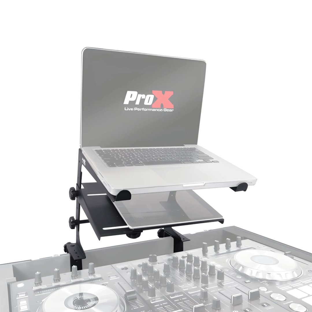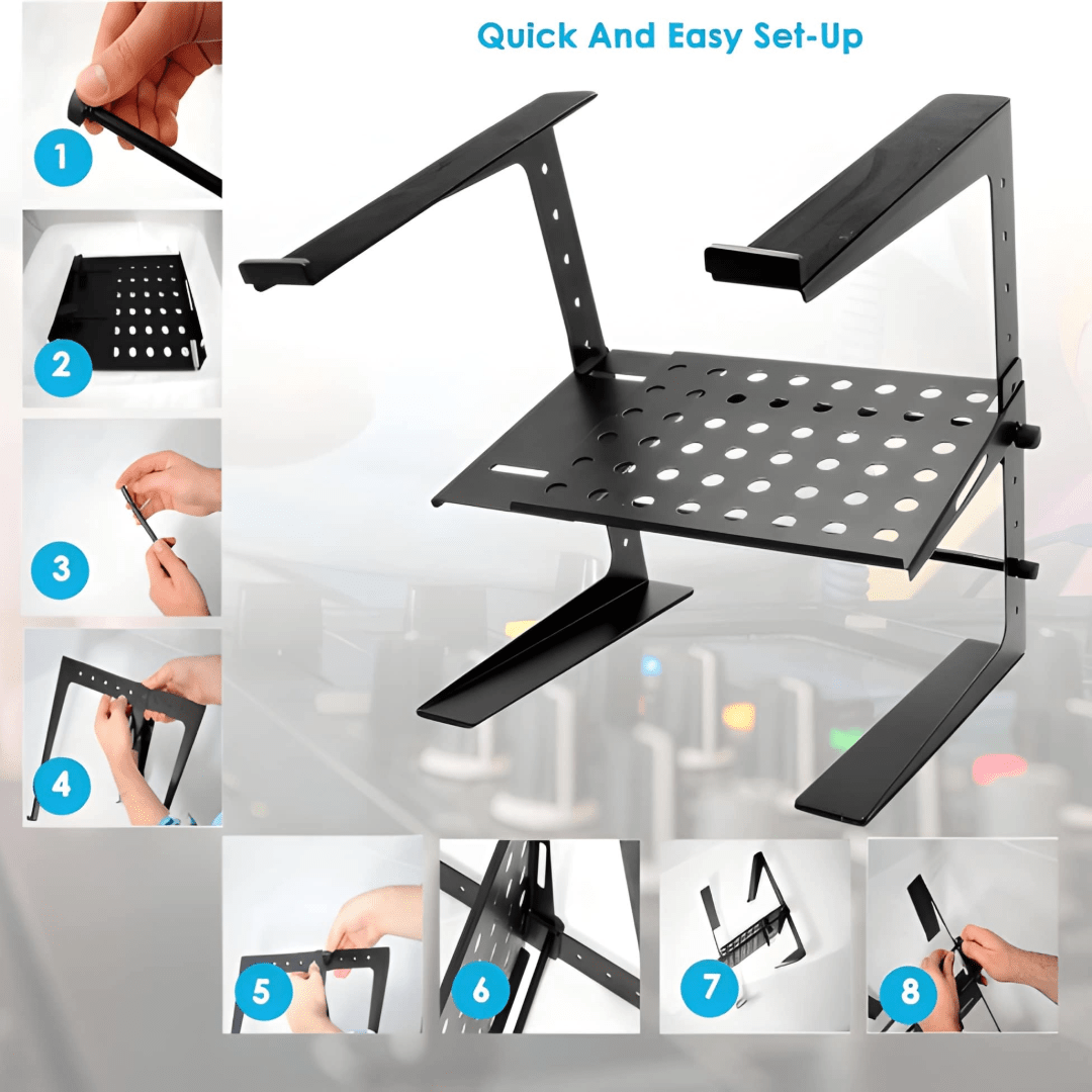 Multi-purpose stand for laptops, small mixers, CD players or DJ equipment 4 possible height settings and 2 pre-set widths Includes desk clamp adaptors for additional stability.