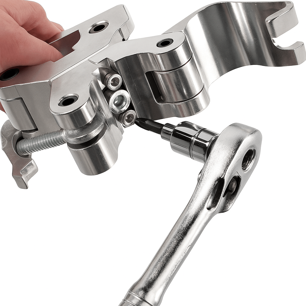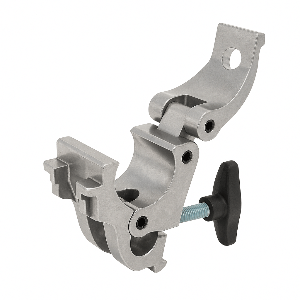 • Heavy-duty half-coupler clamp designed for rigging lighting fixtures and truss systems.