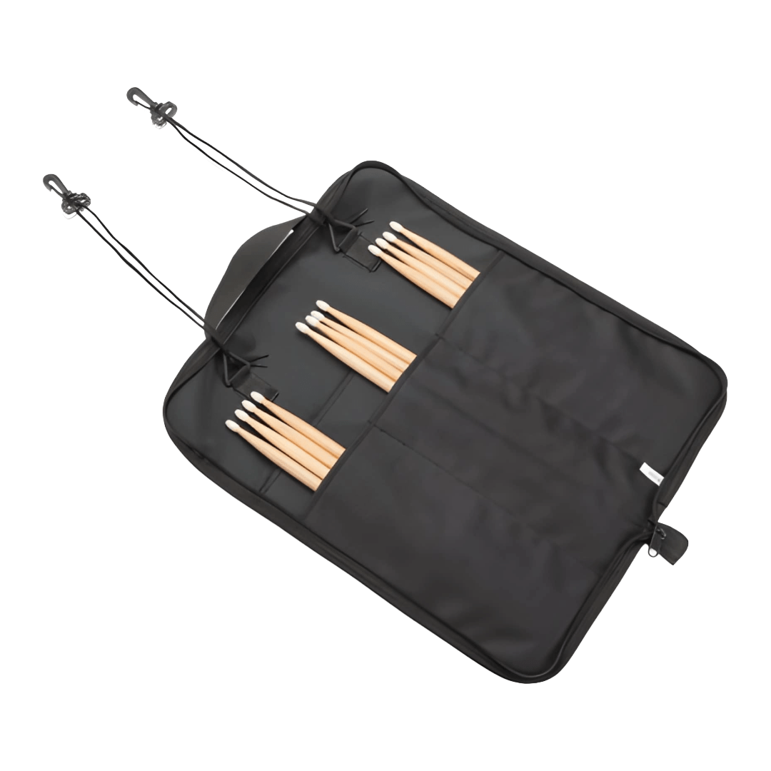 A durable carrying case that can store up to 10 pairs of sticks or any combination of sticks, mallets and/or brushes, ideal for the drummer on the go! Features a carrying handle, oversized zipper and front pouch. Three inner vertical pockets and a mounting string allow you to attach the bag onto a floor tom, offering easy access to your sticks while playing.
