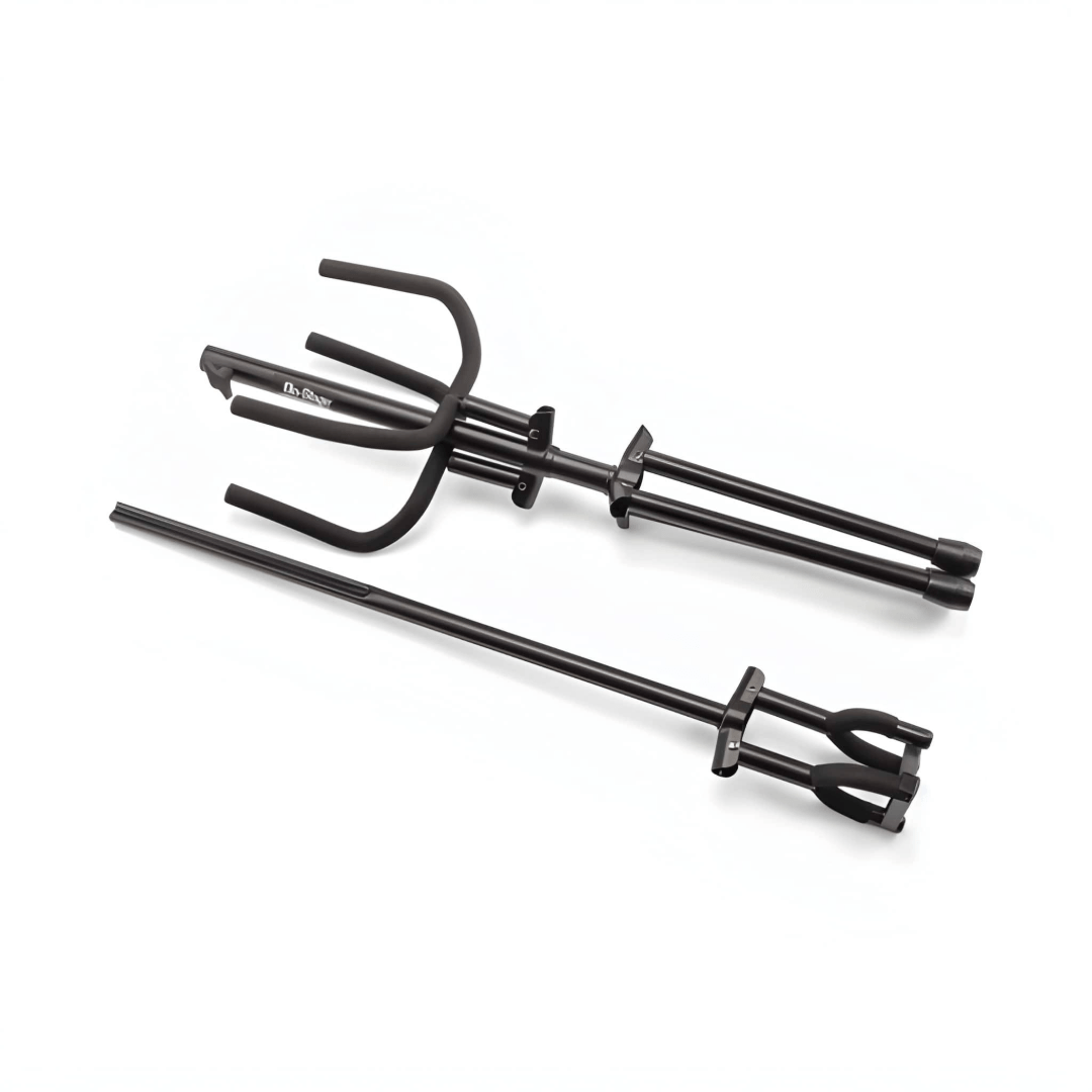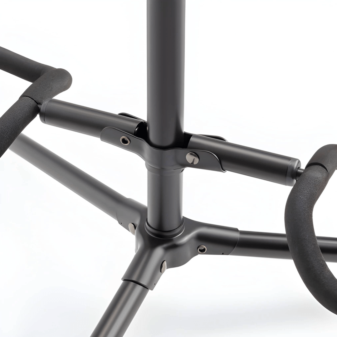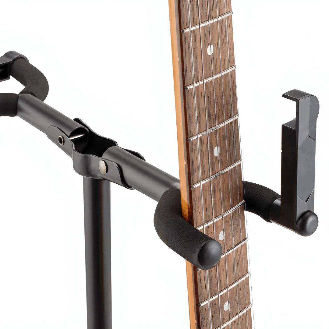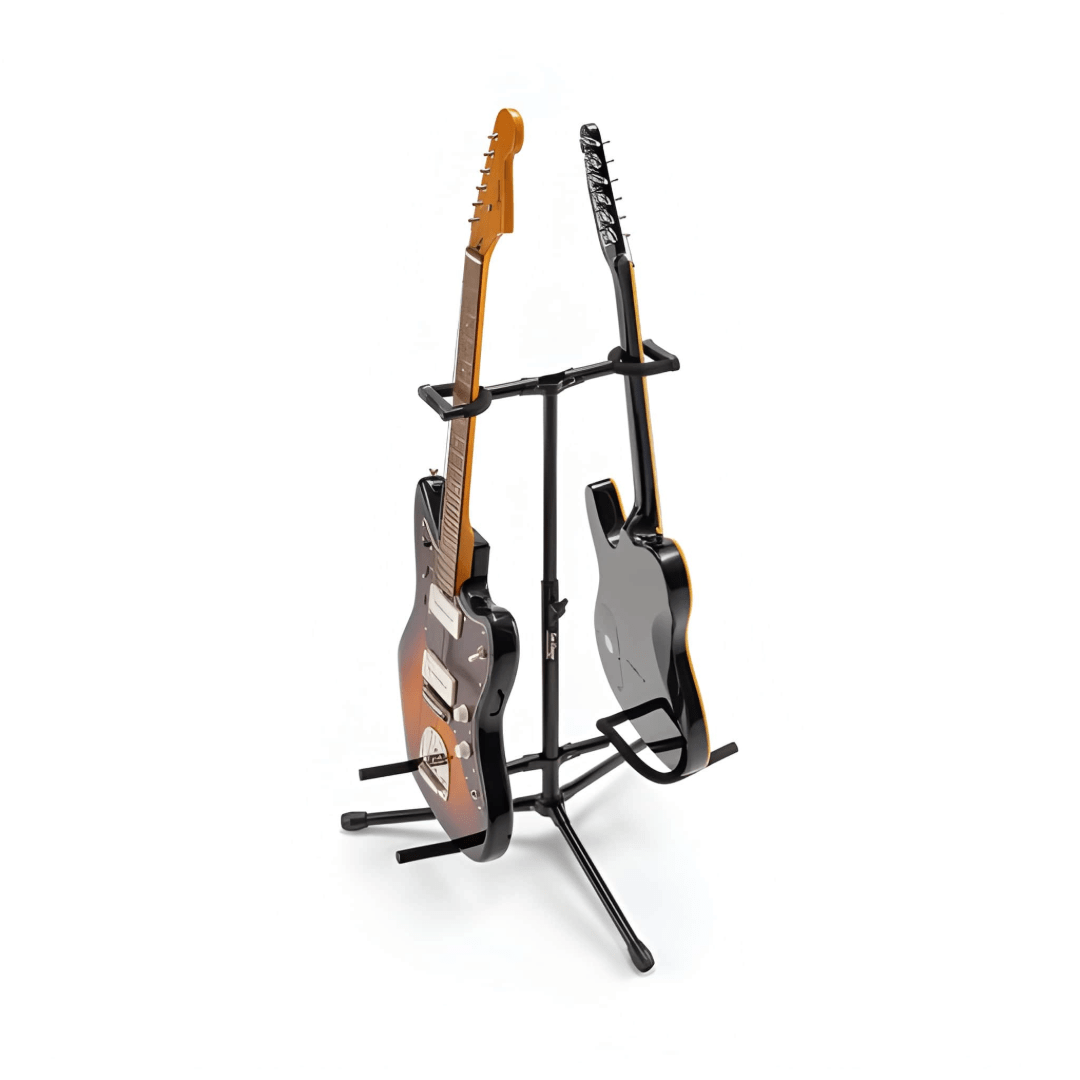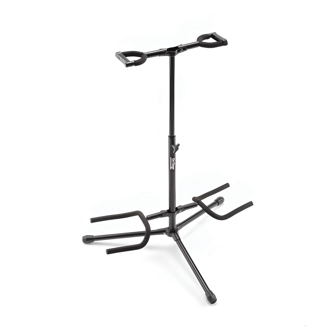 The GS7221BD Deluxe Folding Double Guitar Stand provides easy access to two guitars while storing them safely. The height-adjustable upper yoke shaft and two-point lower yokes fit any traditionally shaped guitar including acoustic, electric, and bass as well as mandolins and banjos. Padding on the yokes protects the instrument finishes and a security latch on the upper yokes prevents the instruments from being bumped off the stand. A wide tripod base provides stability and balance for dependable instrument support. For efficient storage and transportation, the base and all four yokes fold down.