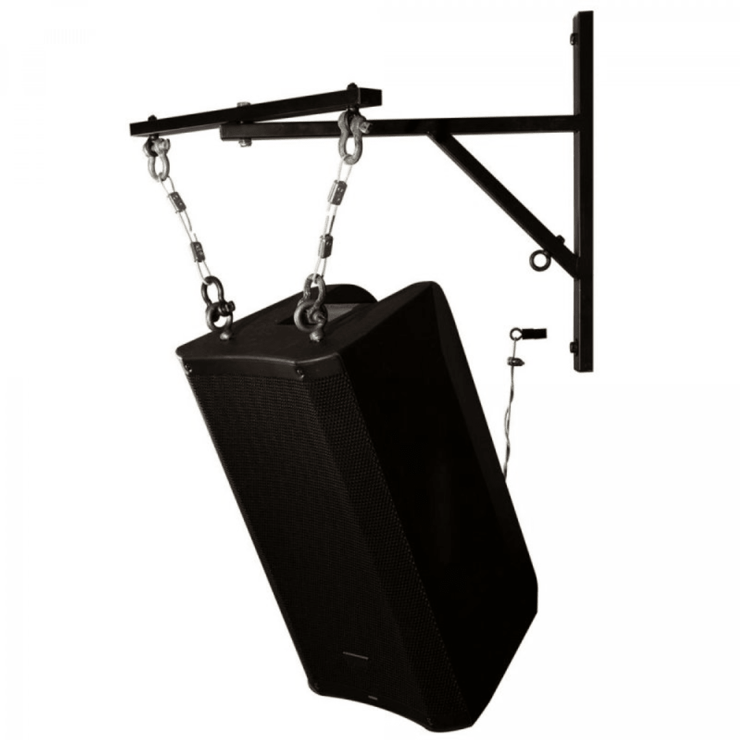 • The bracket mounts to a wall and provides multiple tie points to support a hanging speaker.