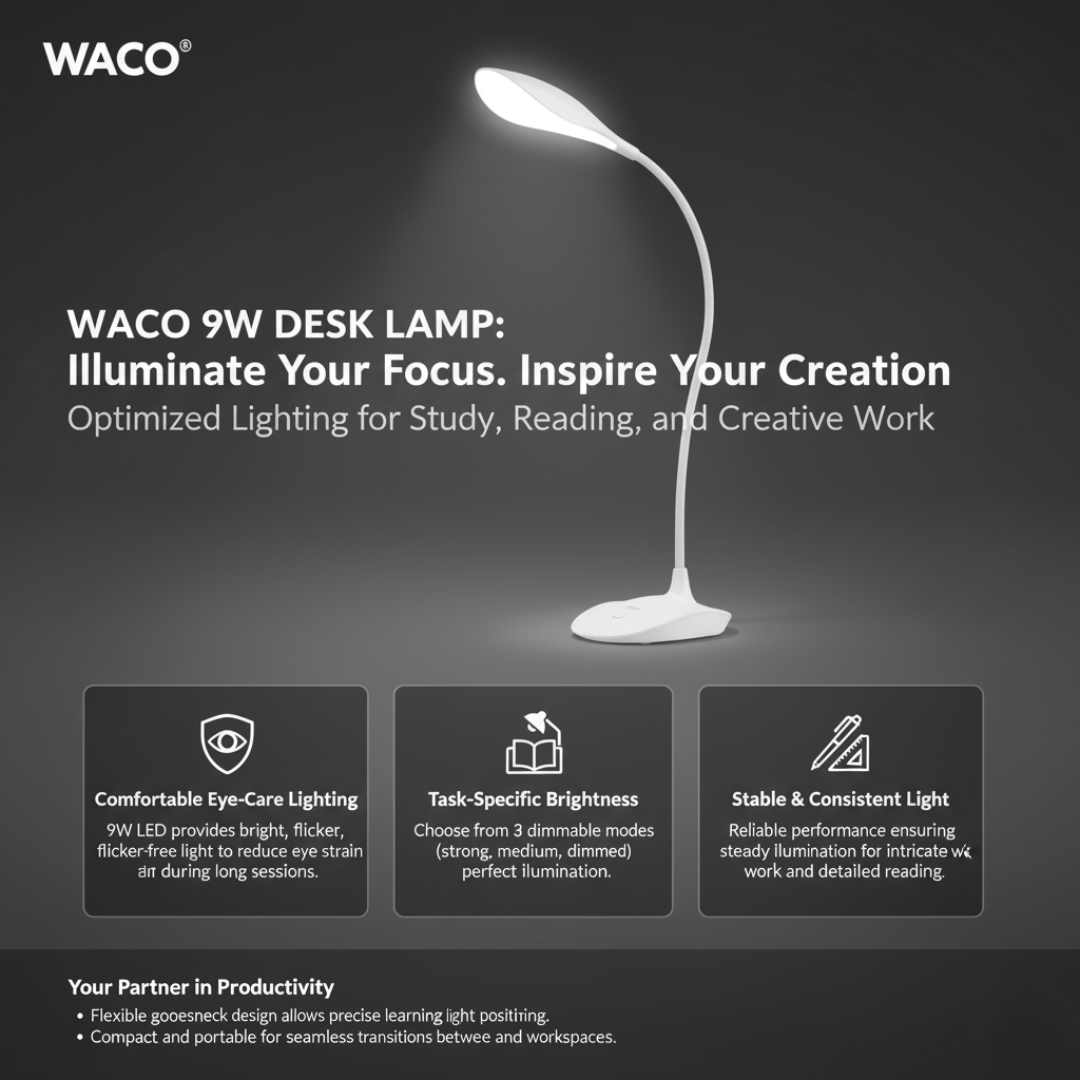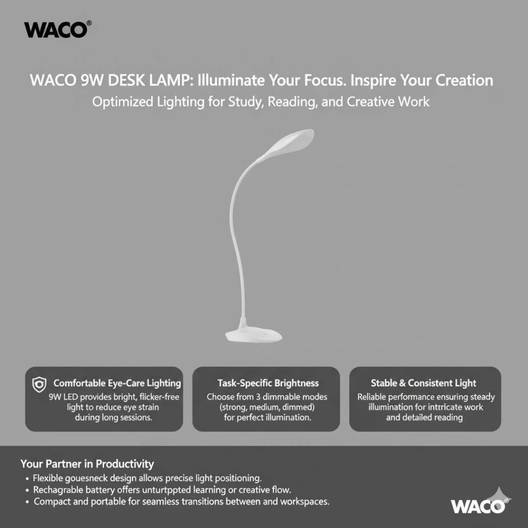 Waco 9W USB Rechargeable LED Desk Lamp: Touch Control, Dimmable, and Portable Detailed Description: Versatile, Portable, and Protected Lighting The Waco Desk Lamp LED 9W offers a modern, flexible, and efficient lighting solution for any home or office workspace. Designed for ultimate portability and convenience, this lamp operates on both AC power and a built-in rechargeable battery, ensuring illumination is available wherever and whenever you need it.