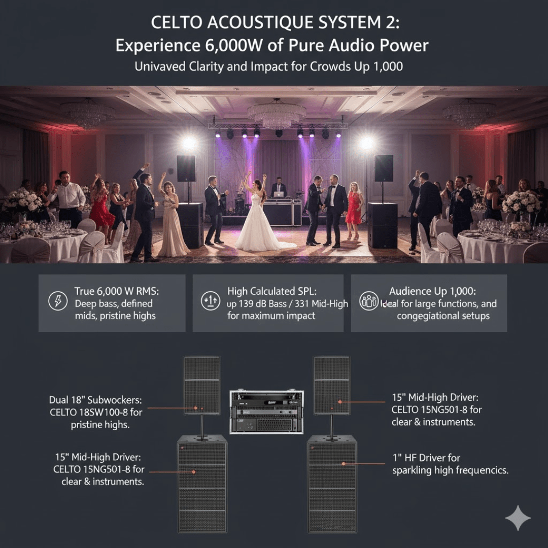 Deep-deep bass just the way we like it! Clear defined Mids & Highs True 6K-watt system reaching your ears Aesthetically beautiful in design CELTO Acoustique is a brand that any rental company should be proud to display on any stage.