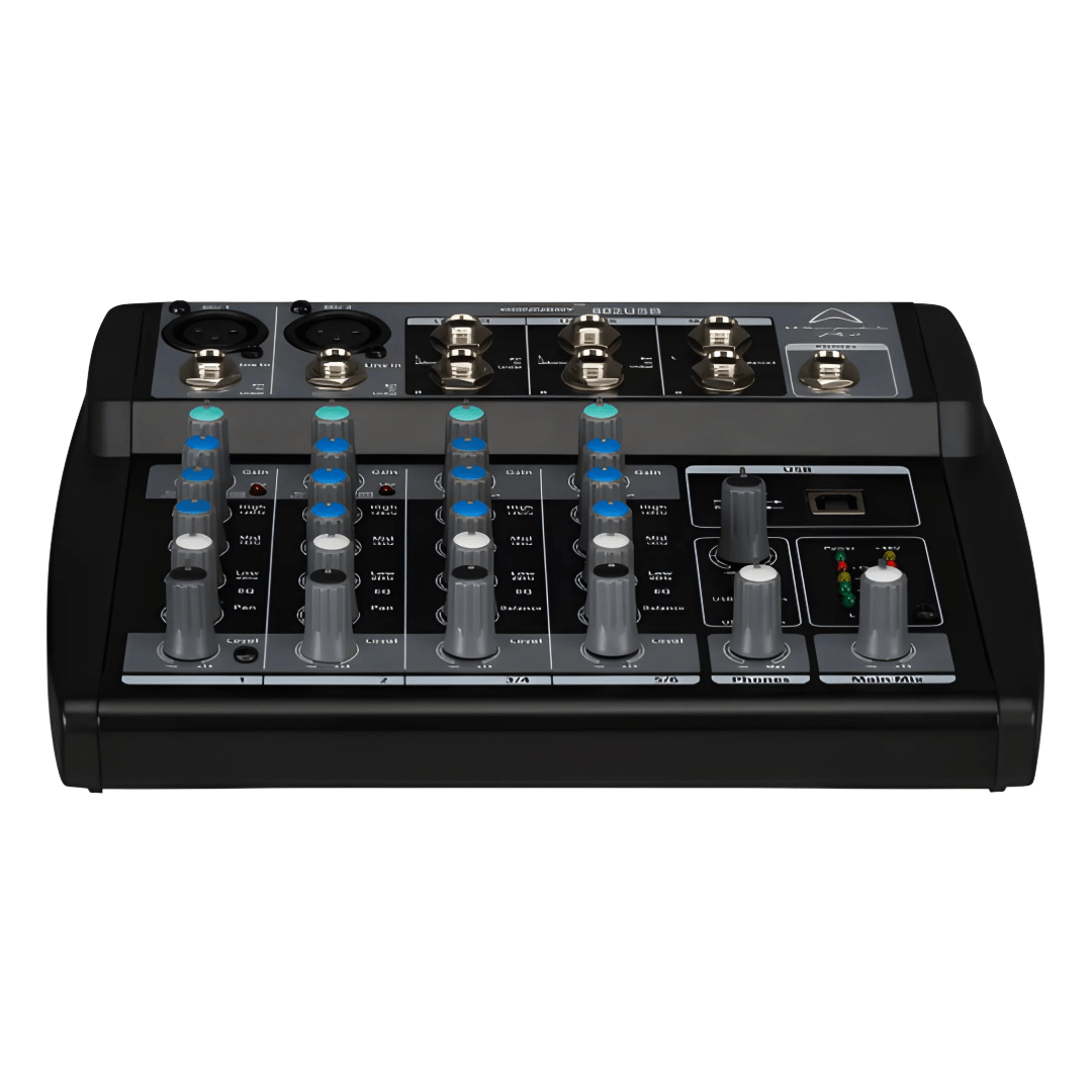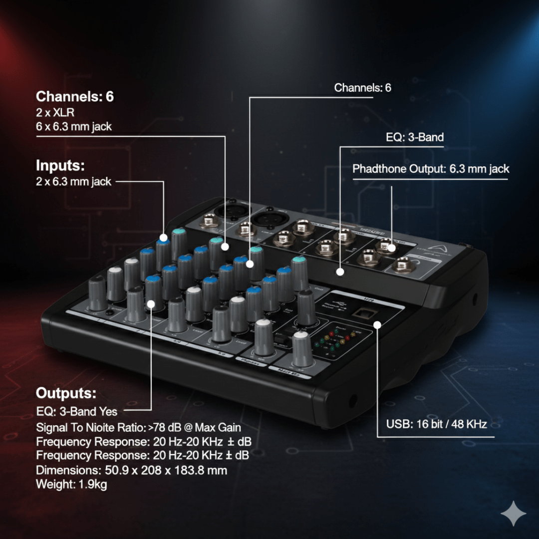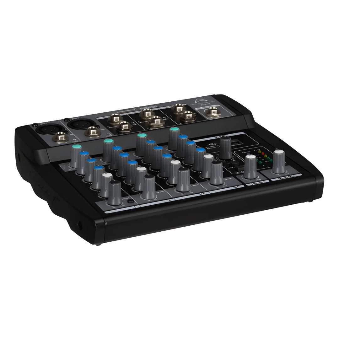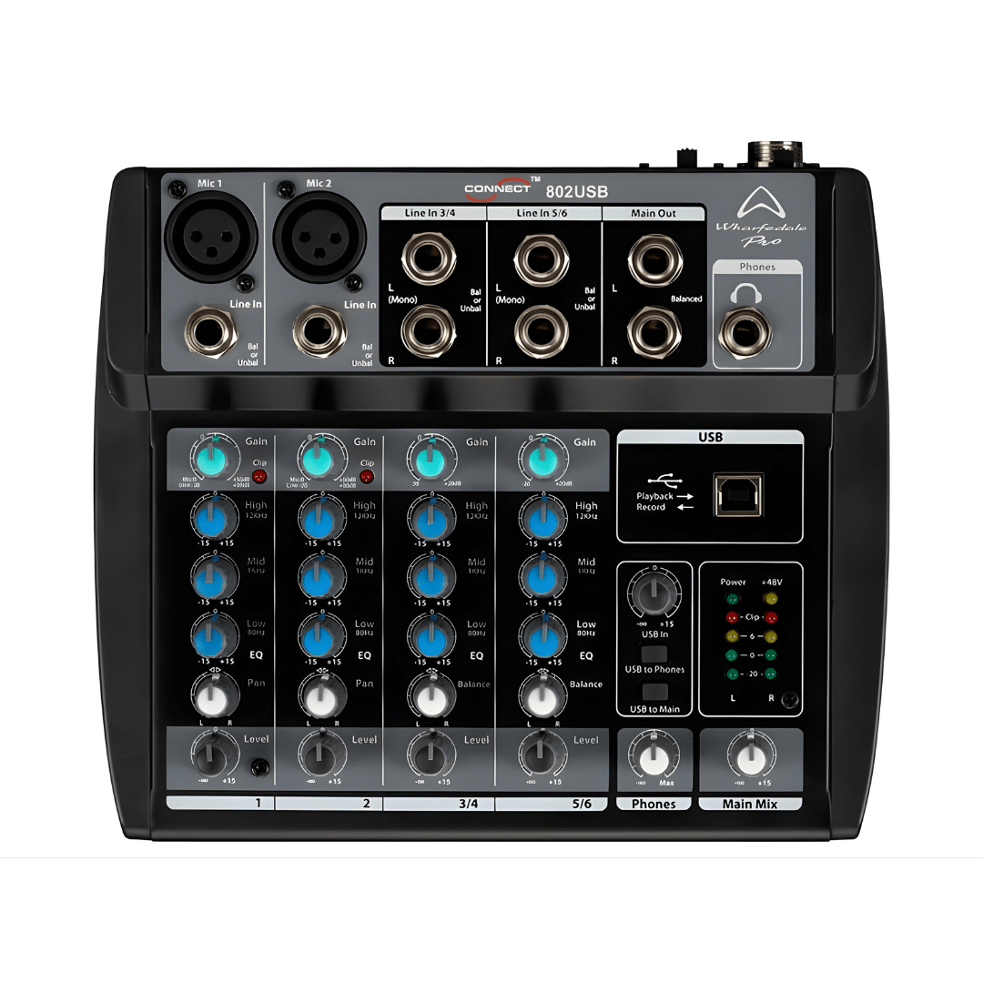 CRAMMED WITH CONNECTIONS There are plenty of connections as you would find in larger desks. Studio grade XLR inputs offer phantom power for condenser microphones. There are also stereo, 2 x 6.3mm jack channels for stereo sources including keyboards and DJ equipment.