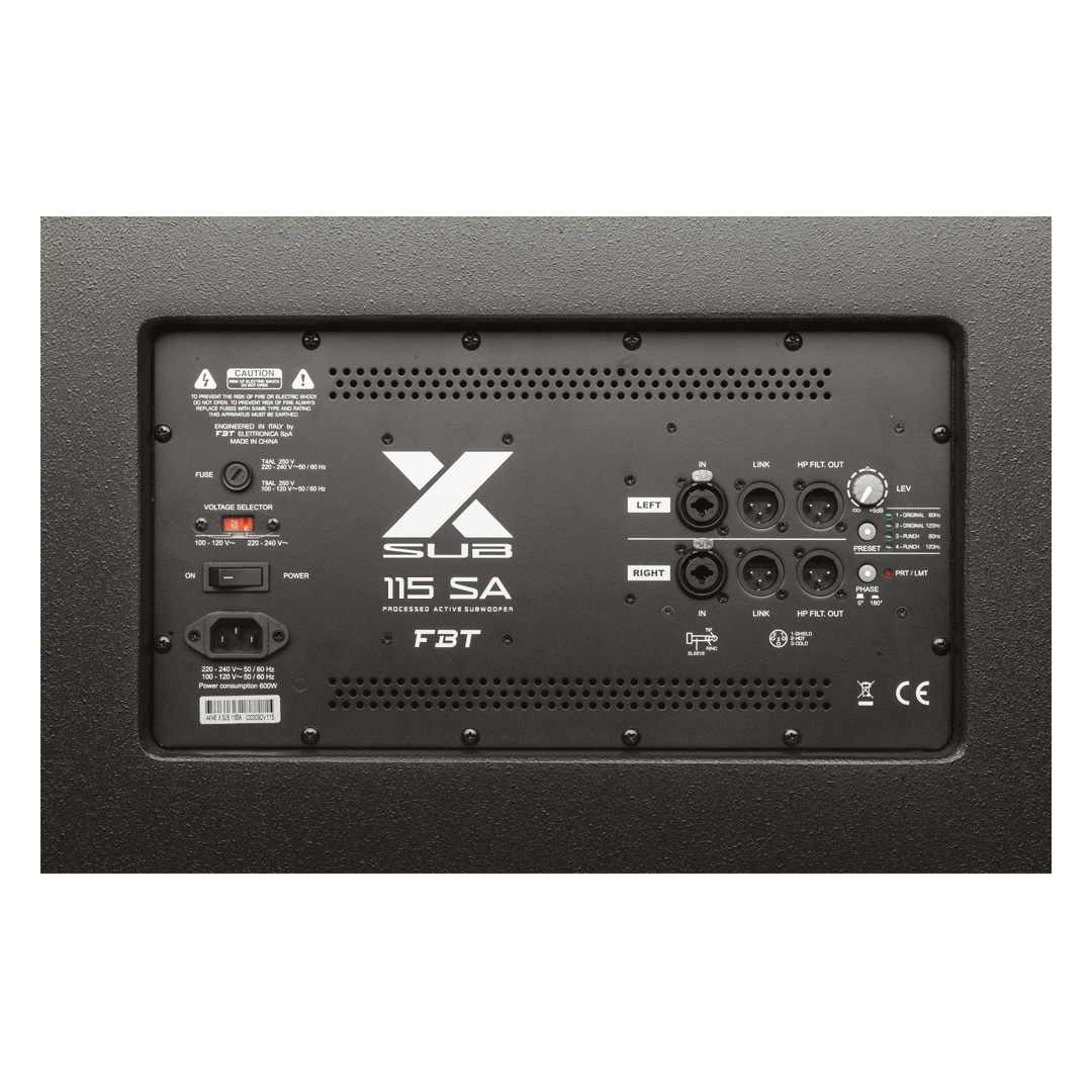 • The FBT X-SUB 118SA provides a DSP processor with 4 presets (2 responses with 2 different cut-off frequencies). The FBT X-SUB 118SA feature 0,70" birch plywood construction with scratch resistant black paint finish with M20 top mounted stand adapter, two FBT design aluminium handles and four optional 100mm/3,93" transport wheels.