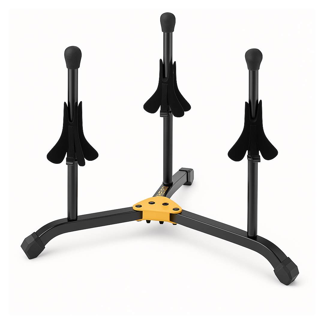 The Two Trumpets/Cornets and One Flugelhorn/Soprano Sax Stand from HERCULES Stands is a compact stand with detachable pegs for resting three instruments. Two of the instrument pegs can hold either a trumpet or a cornet, while the third fits a flugelhorn or a soprano sax. A height-adjustment lever on each of the pegs makes it simple to accommodate instruments of various sizes.