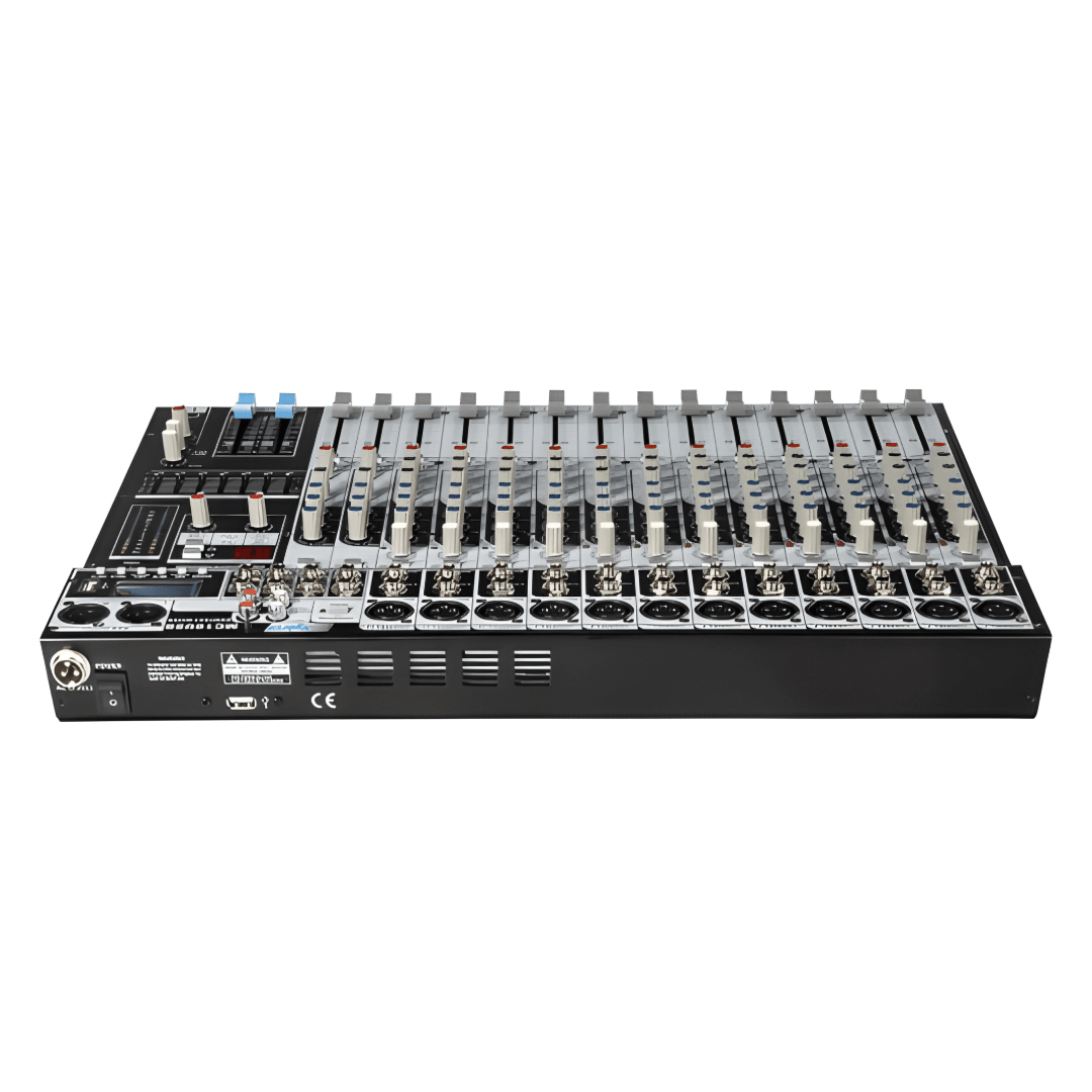 Mono Channels: 12, XLR (Mic) and 1/4″ Jack (Line) with independent rotary Gain and Level fader controls