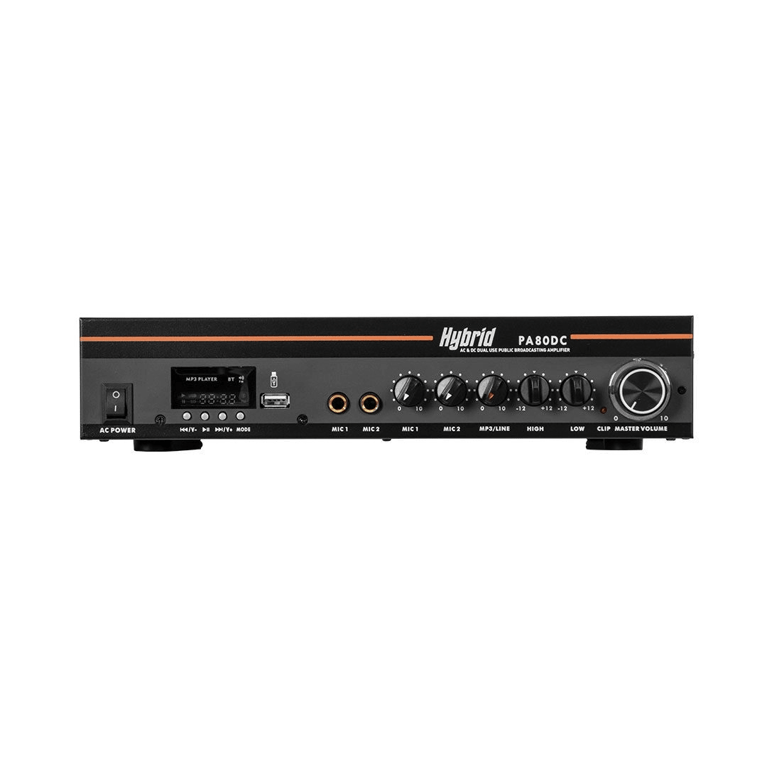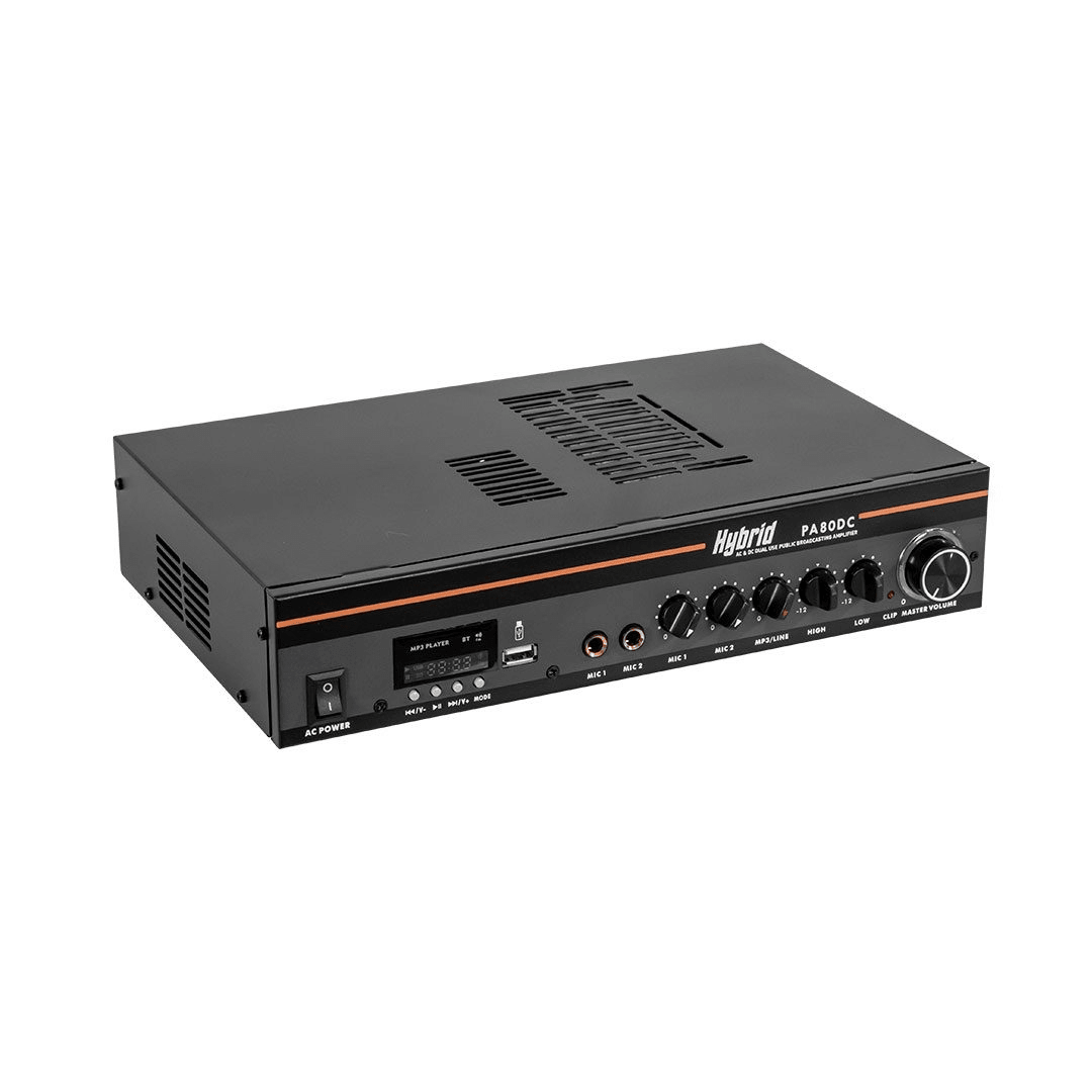 The Hybrid PA80DC is an entry level, well priced, mid format public address amplifier that can be powered by either 220V mains or a 12V DC battery / power supply.