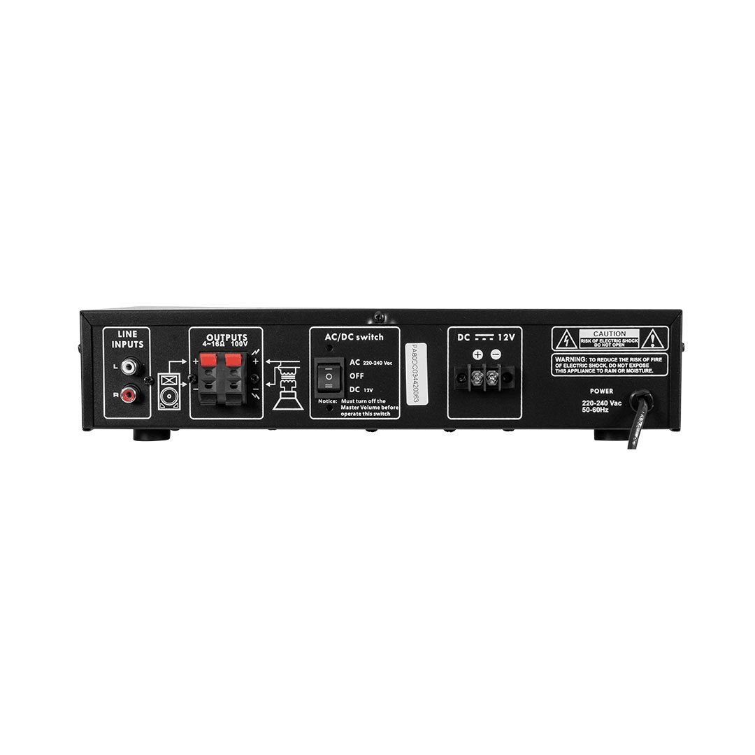 The PA80DC 100V line output allows for numerous ceiling mount or other 100V line speakers to be connected using the same line over a long distance, simplifying the installation and reducing costs on wiring and labour.