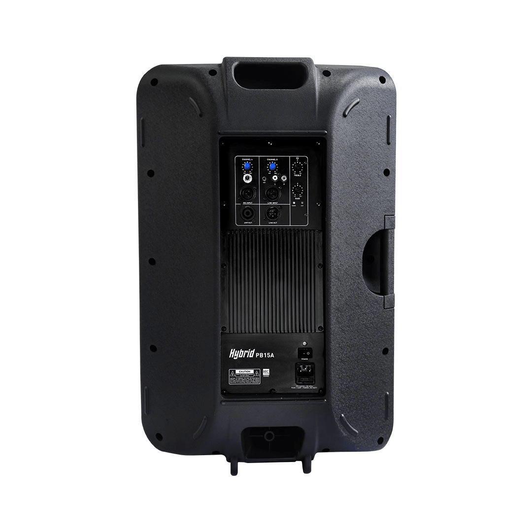 The Hybrid PB15A is an active, 2 channel input (15″ low frequency speaker with a 1″ high frequency compression driver) ABS enclosed speaker cabinet.