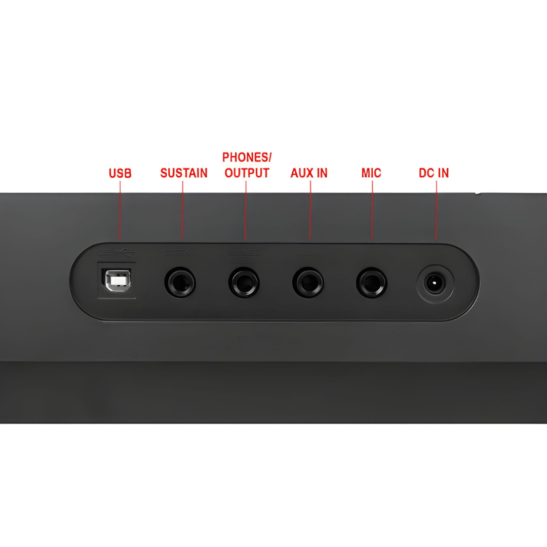 • Connections: DC-power, USB-MIDI, headphone / output (6,3 mm jack), input (6,3 mm jack), microphone (6,3 mm jack), pedal sustain