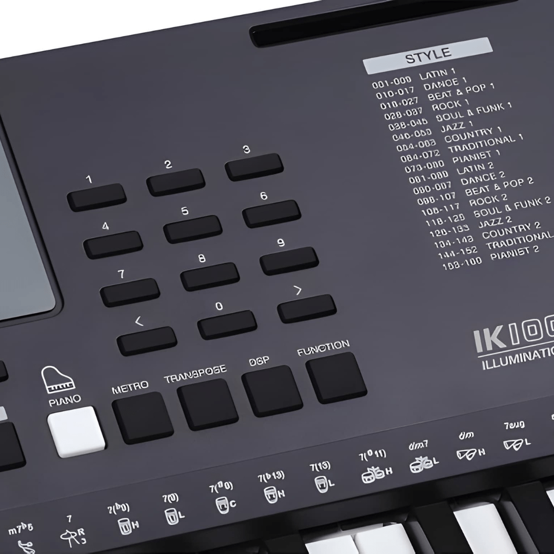 • With its 480 voices you’ll have more than enough choice. The IK100 is equipped with great retro styles and therefore perfect for more modern music styles like pop, hip hop and many other genres. For more expression in your playing there is a sustain pedal connection, but it also features a line in and microphone connection. You can both sing and play along with your favorite music.
