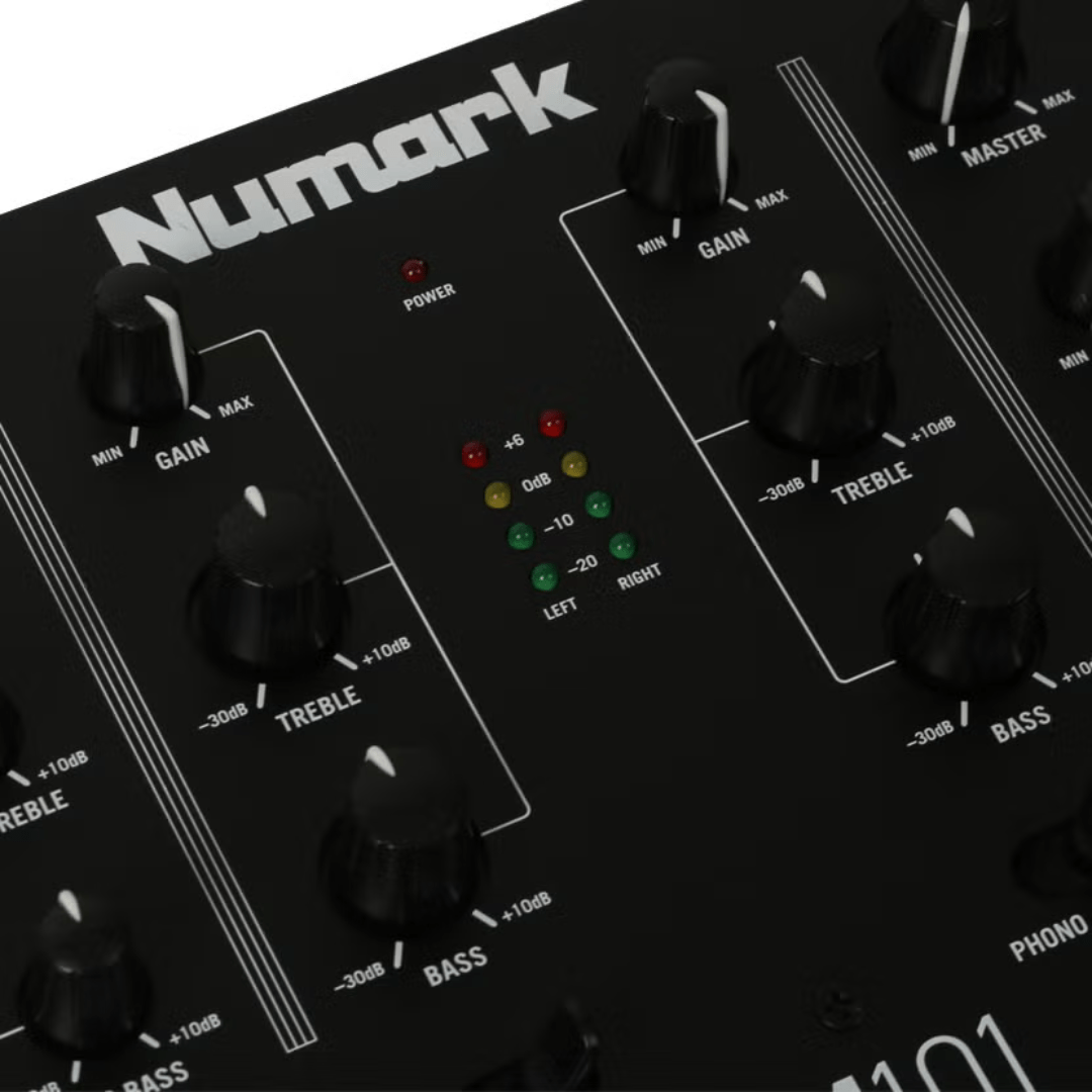 TWEAKABLE TUNES Beyond simply mixing, M101USB has a built-in EQ so that you can fine tune your mix depending on the room or the tracks themselves. Two pairs of switchable Phono/Line inputs are included along with a crossfader, ¼” mic input and stereo RCA line output for connection to an amplifier, powered speakers or another mixer. M101USB can be rack-mounted and features Numark’s legendary industrial-grade durability.