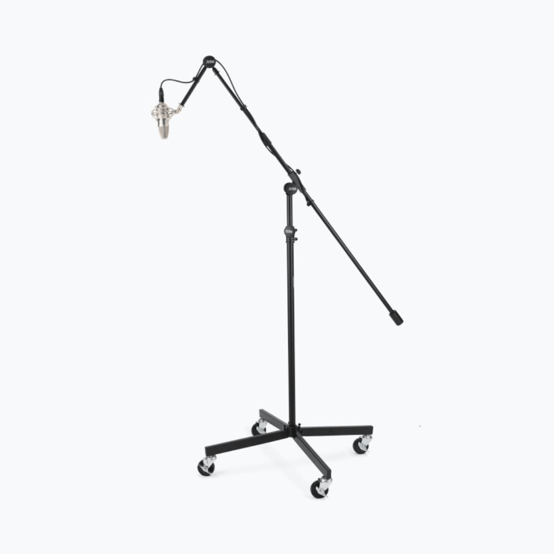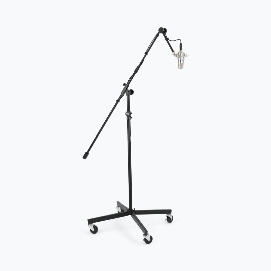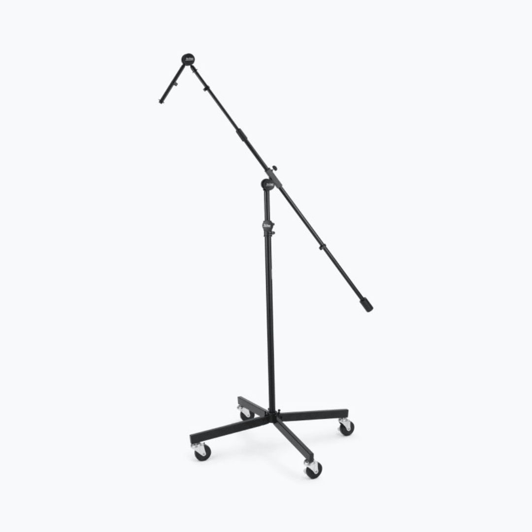 The height-adjustable SB96+ Tripod Studio Mic Boom with 7" Mini Boom Extension combines an extra-long telescoping boom with an adjustable-angle 7" extension shaft. This configuration enables precise mic placement in a huge variety of angles and heights and also features a counterweight that balances heavy mics for ease of positioning. Four locking folding legs on locking casters create a super stable foundation that is also easy to move. The base folds down for convenient storage and transportation.