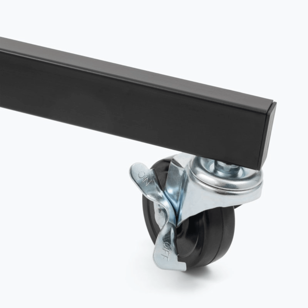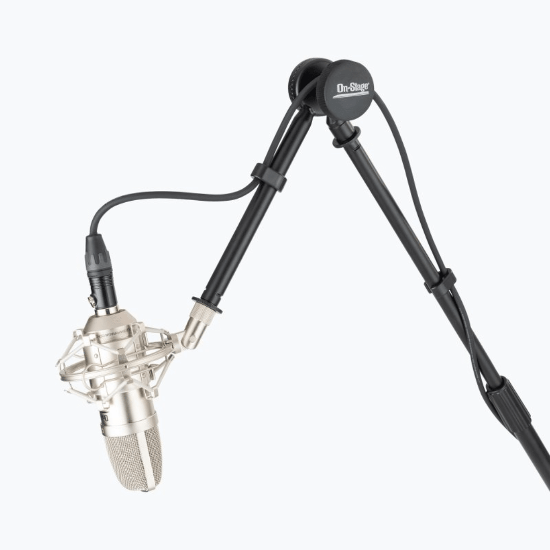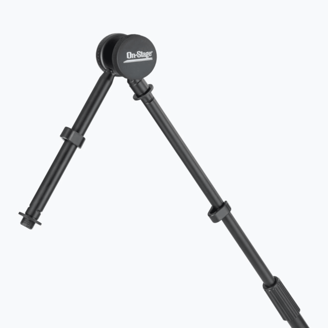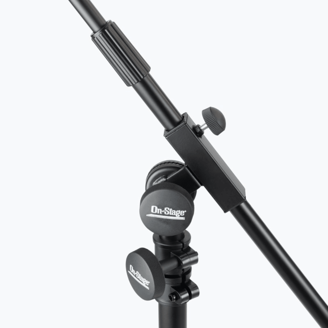 The height-adjustable SB96+ Tripod Studio Mic Boom with 7" Mini Boom Extension combines an extra-long telescoping boom with an adjustable-angle 7" extension shaft. This configuration enables precise mic placement in a huge variety of angles and heights and also features a counterweight that balances heavy mics for ease of positioning. Four locking folding legs on locking casters create a super stable foundation that is also easy to move. The base folds down for convenient storage and transportation.