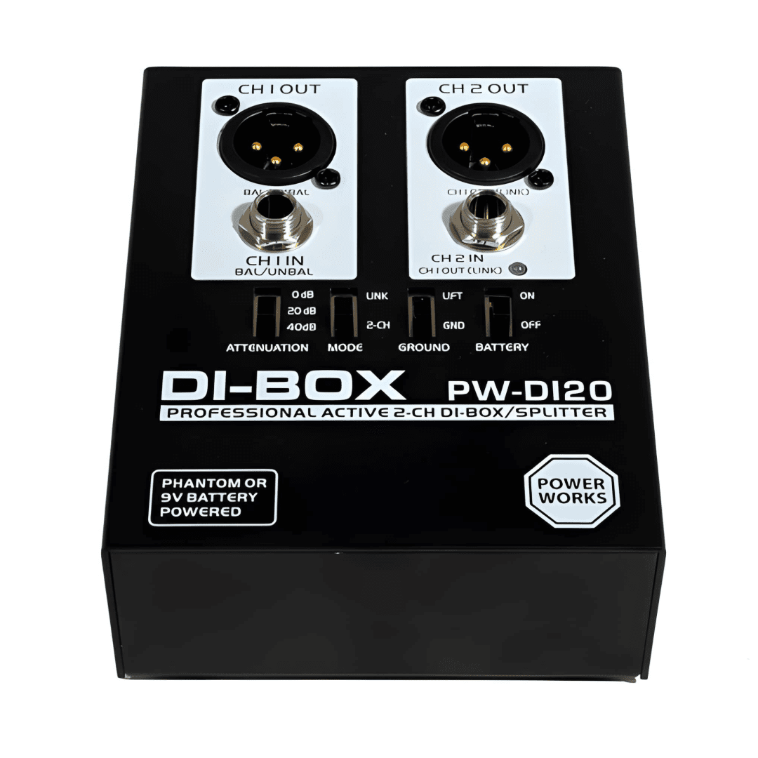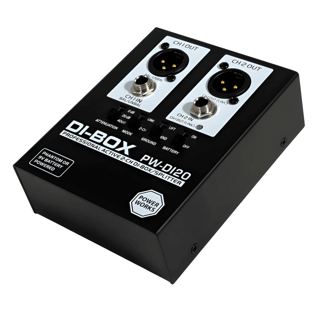 The PowerWorks PW-DI-20 is a professional active 2-channel DI box designed for studio and stage use, offering precise impedance matching, noise-free signal transmission, and versatile features like split mode and ground lift.