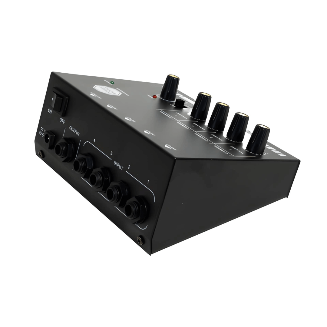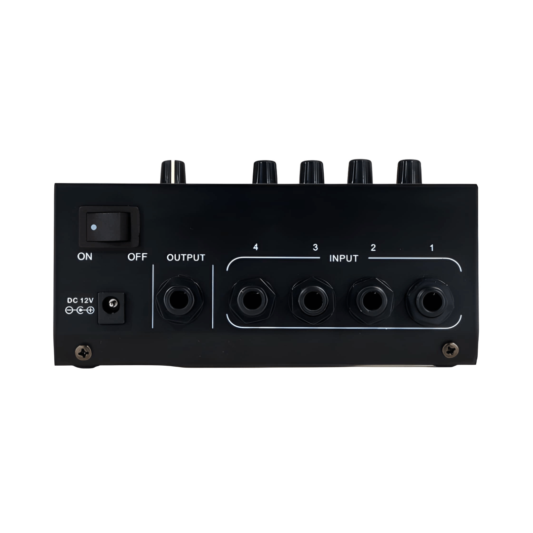 • Four Independent Channels Each of the four input channels comes with individual volume control knobs, allowing for precise adjustments and a tailored audio mix.