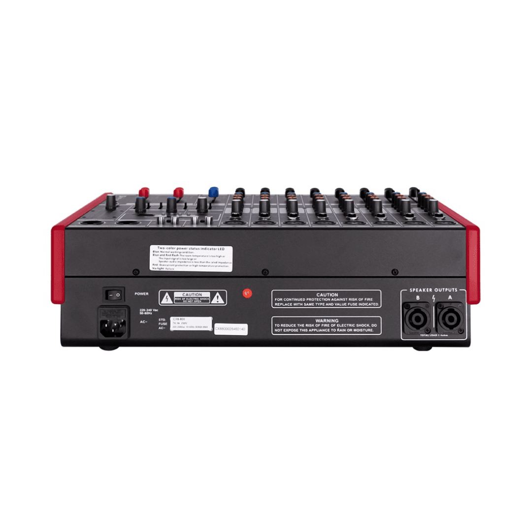 • The CX8-800 offers a solid combo of connectivity (USB & Bluetooth), audio control (EQ, phantom power), and portability-all in a powered mixer format. It's well-suited for semi-professional use in gigs, recording, and event setups. If you're seeking to amplify and manage a diverse audio setup with minimal gear.
