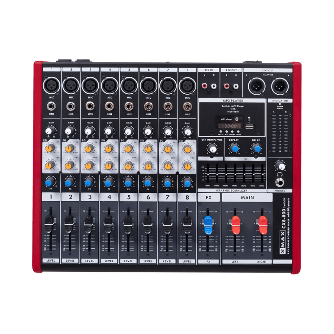 • The XMAX CX8-800 is an 8-channel professional audio mixer designed for both live and studio applications. It combines solid control features with modern connectivity, making it a versatile choice for DJs, bands, podcasters, and venue audio setups.